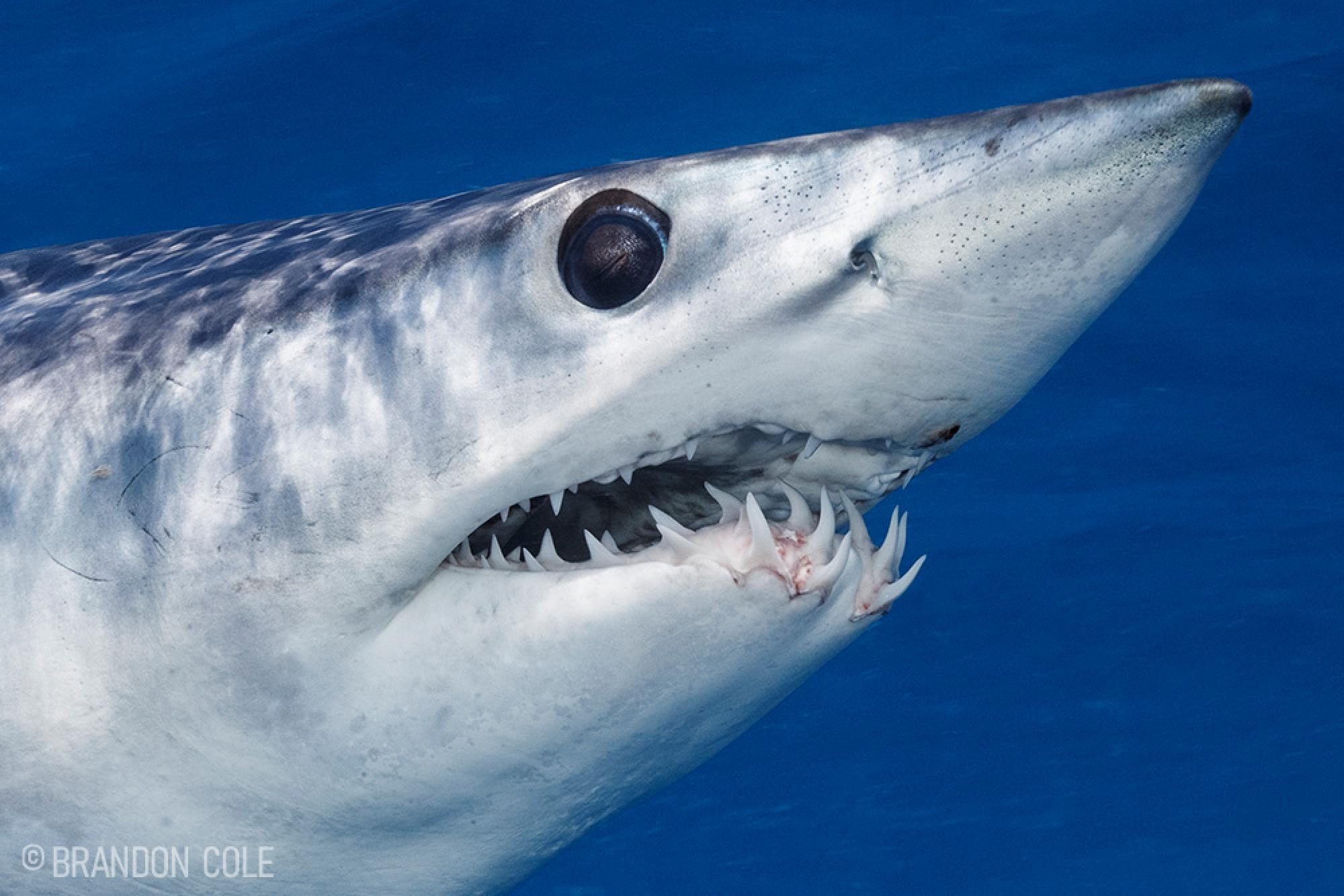 Blues arrive on the scene a bit later. I’m fascinated by the contrast between the two species. Compared to the mako’s twitchy, electric movements and its seemingly dead eyes and soulless smile out of a slasher movie, blue sharks are all serpentine grace, lazily gliding on the sea winds. Their eyes are shaped more like a cat’s, though silvery with cerulean and golden flecks catching the light, I observe, when one pauses inches in front of my camera. Their teeth go mostly unnoticed underneath the almost comically big nose, whereas mako dentition is permanently on display front and center, recurved daggers bristling from gaping maw. Both predators are perfect in their own way, evolutionarily fine-tuned over hundreds of millions of years to their lives at sea. I’m beyond thrilled to make their acquaintance.