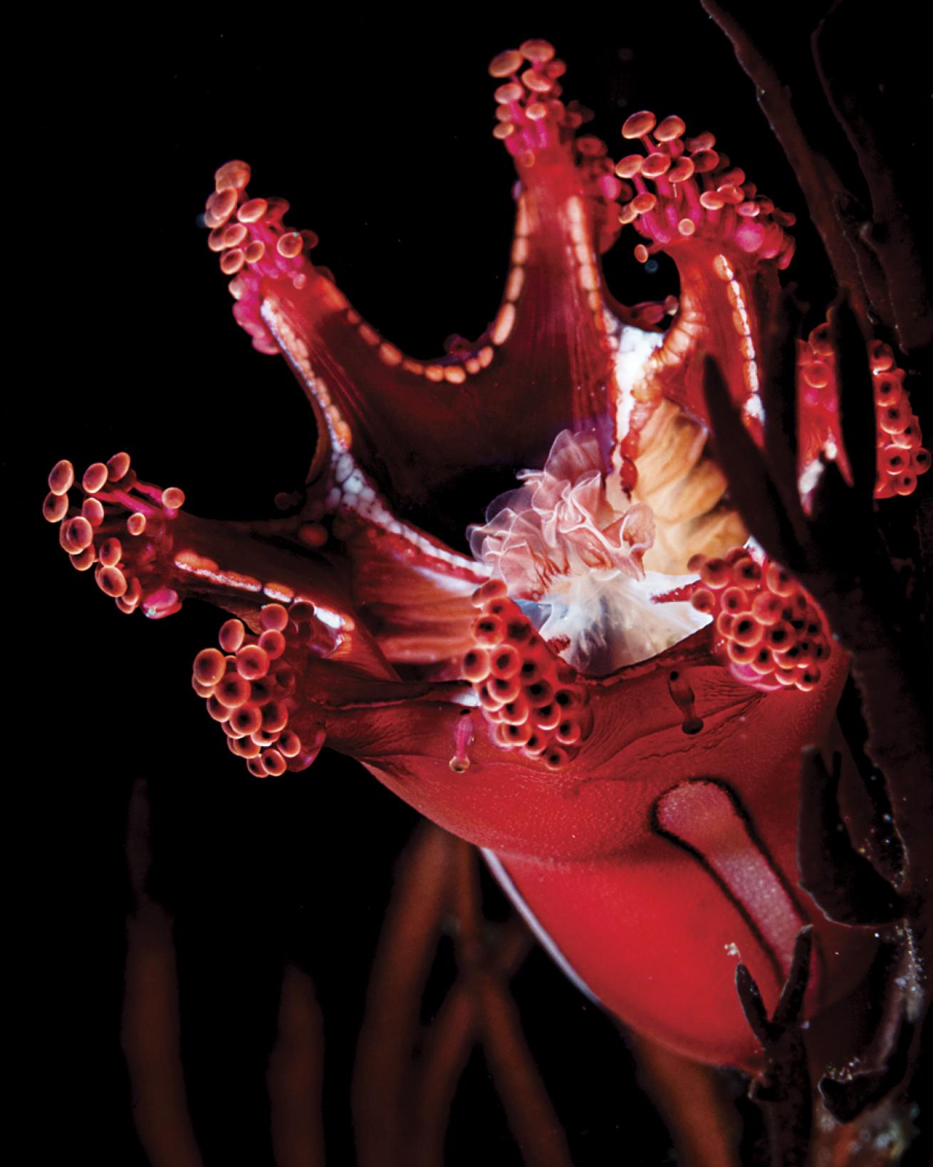 Patrick WebsterThe “grape clusters” of stinging tentacles give away the medusoid nature of this Manania handi stalked jellyfish.