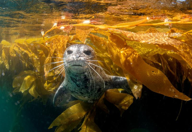 Somebody kelp me. I’m seeing staurozoans! Jellyfish chandeliers are swinging from the kelpy sea-lings; wow, what a treat! I’ve seen similar stalked medusae a handful of times back home in Monterey Bay, California, but never in these numbers—they are everywhere. And are those sea stars crawling up the fronds to nab them? Staurozoans are a coldwater diver’s delight and might as well be our mascots. The 50-some species of anemone-adjacent, “settled sea nettle,” reef estate–owning jellyfishes decidedly avoid warm waters, preferring chilly and colder waters to both planetary poles. “Antitropical distribution” say the books—heh, kind of like me these days, they steer clear of warm equatorial waters. Haliclystus antarcticus, it’s a pleasure to meet you.