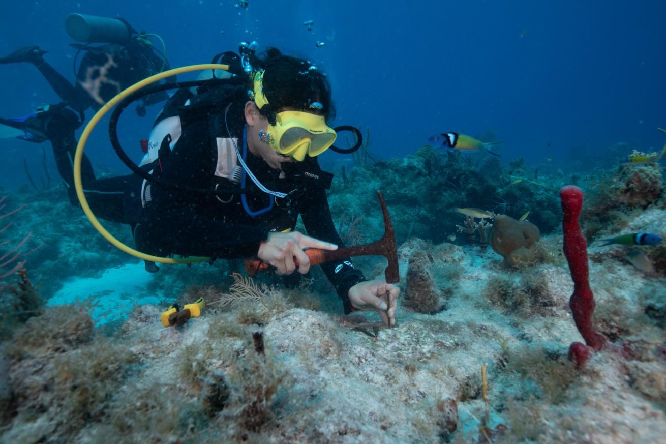 Norah and four other interns demonstrate how to outplant coral—first on land for practice, and then underwater where communication is more difficult. Today we will be working with staghorn coral, which was once a dominant species on the diverse Florida reef ecosystem but has now been reduced to a mere 3 percent of its former abundance due to several factors, including coral disease and bleaching events.