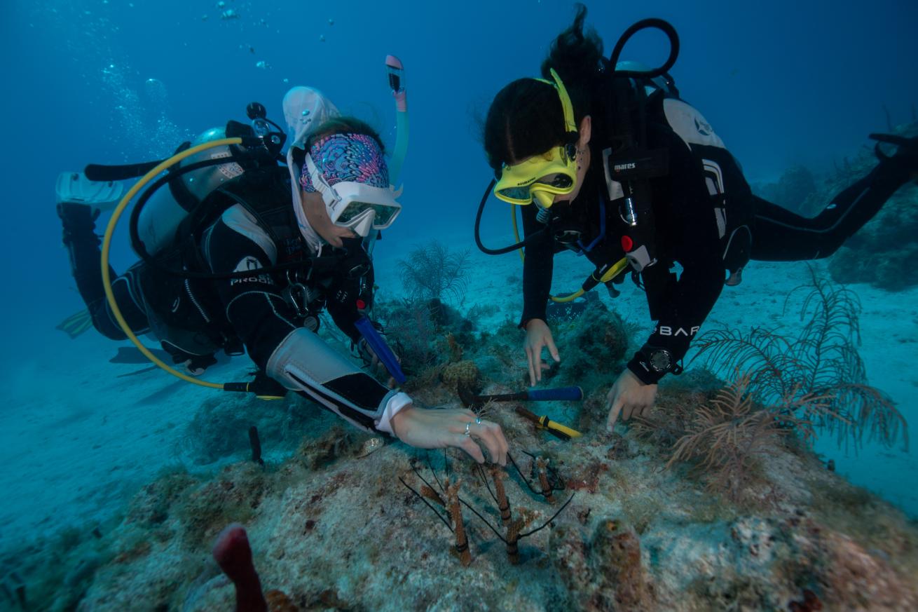 Kristin PaterakisAn intern with I.CARE assists Rhyanna Rispoli in planting coral