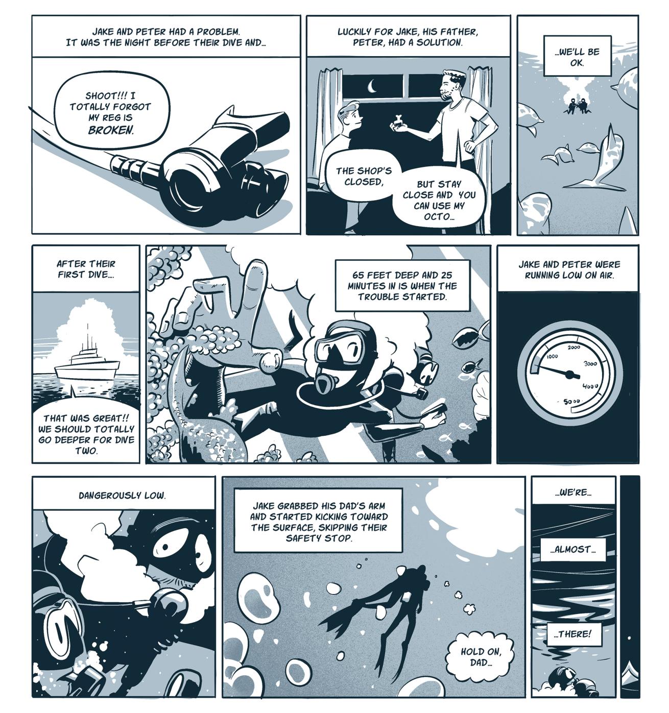 The next day, on their friend’s boat, Peter and Jake were having a blast. The first dive went well; they swam shoulder to shoulder and stayed shallow—they even saw a pod of dolphins! Sharing the gear went off without a hitch, but now it was time for their second dive. With newfound confidence in their approach, the pair descended to 65 feet. About 25 minutes into the dive, Peter looked at their gauge and realized that they were very low on air. Sharing a tank led to faster air consumption than they had anticipated.