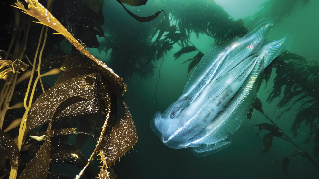 Patrick WebsterA winged comb jelly (Pterygiocteis pinnatus) soars past Patagonian giant kelp off Tierra del Fuego, South America.