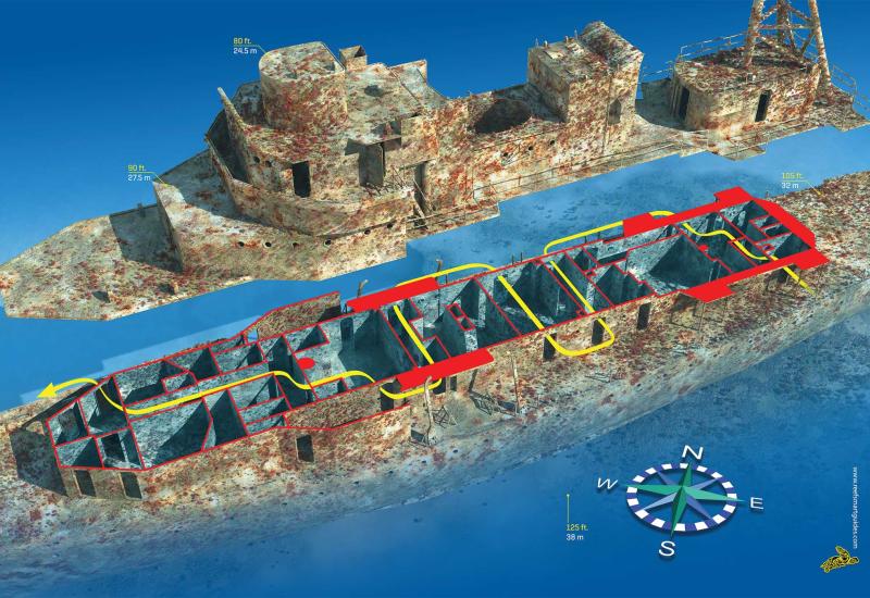 Easy entry and exit points to the interior of the hull make the Pamir a favorite among wreck divers. “Inside the wreck you’ll find a large winch that is inhabited by Spanish and slipper lobsters along with other crustaceans, but the adventure doesn’t end here,” says Browne. “On the port side there is a small “Yellow Submarine,” which is visible from the wreck on a clear day. The submarine is surrounded by a variety of corals, and if you are lucky, you may be able to spot a seahorse hanging out on one of the nearby sponges.”