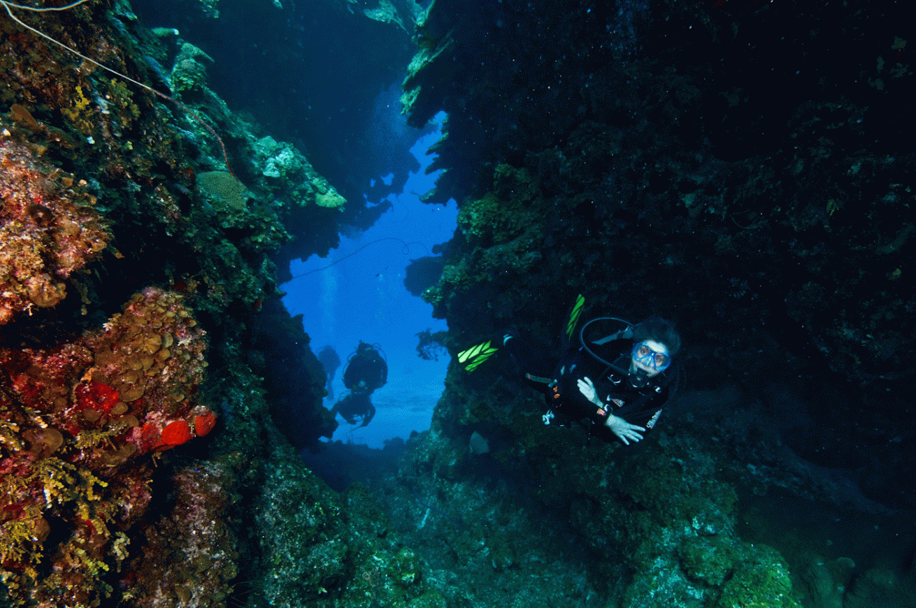 The reef and wall architecture at Hole in the Wall — with its exploration-worthy swim-though, shallow reef punctuated by coral heads and the occasional pinnacle or large coral mound — is typical of many sites off Eleuthera, including Tunnel Rocks, Cut-Through City, Jake's Hole, Split Coral Head and Cave Rock.