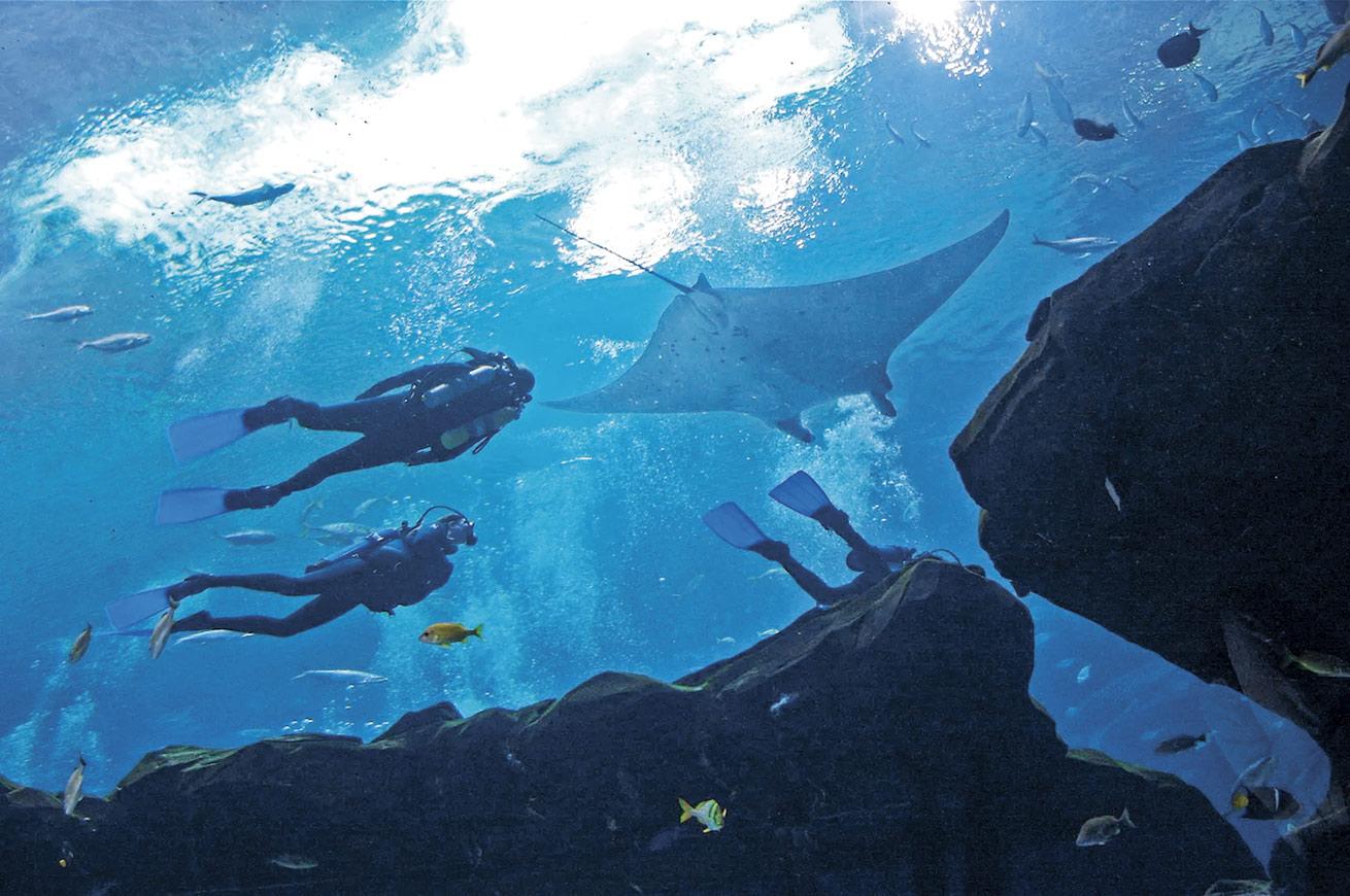 Courtesy Georgia AquariumA manta soars overhead as divers explore the aquarium’s giant tank.