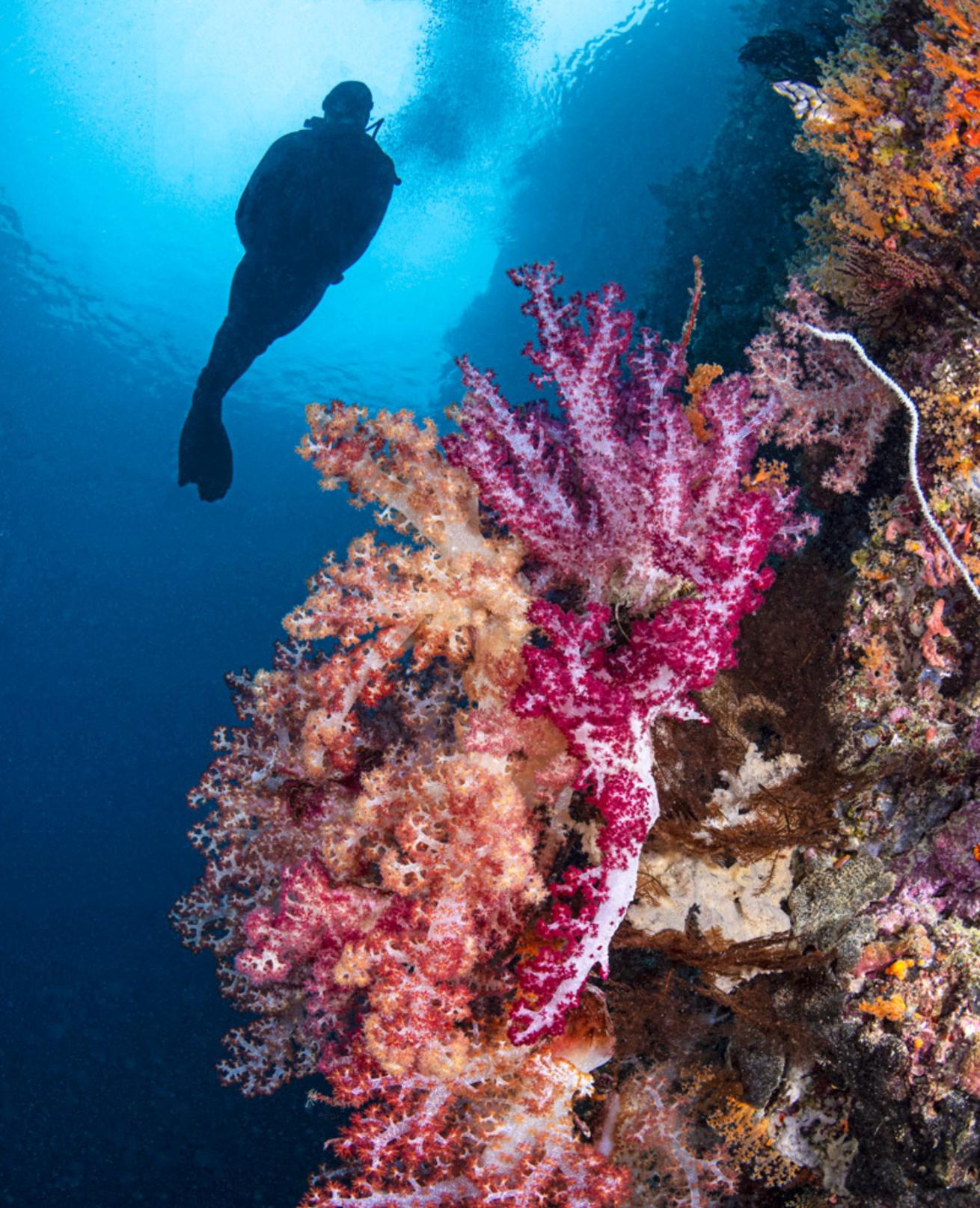 There’s no need to descend very deep here. Every jaw-dropping inch is layered with multihued soft coral and fans, nearly all the way to the surface.