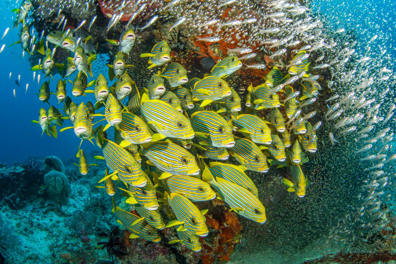 Andy Sallmon and Allison Vitsky SallmonA school of sweetlips is encompassed by a swirl of glassfish at Raja Ampat’s Otdima Reef.