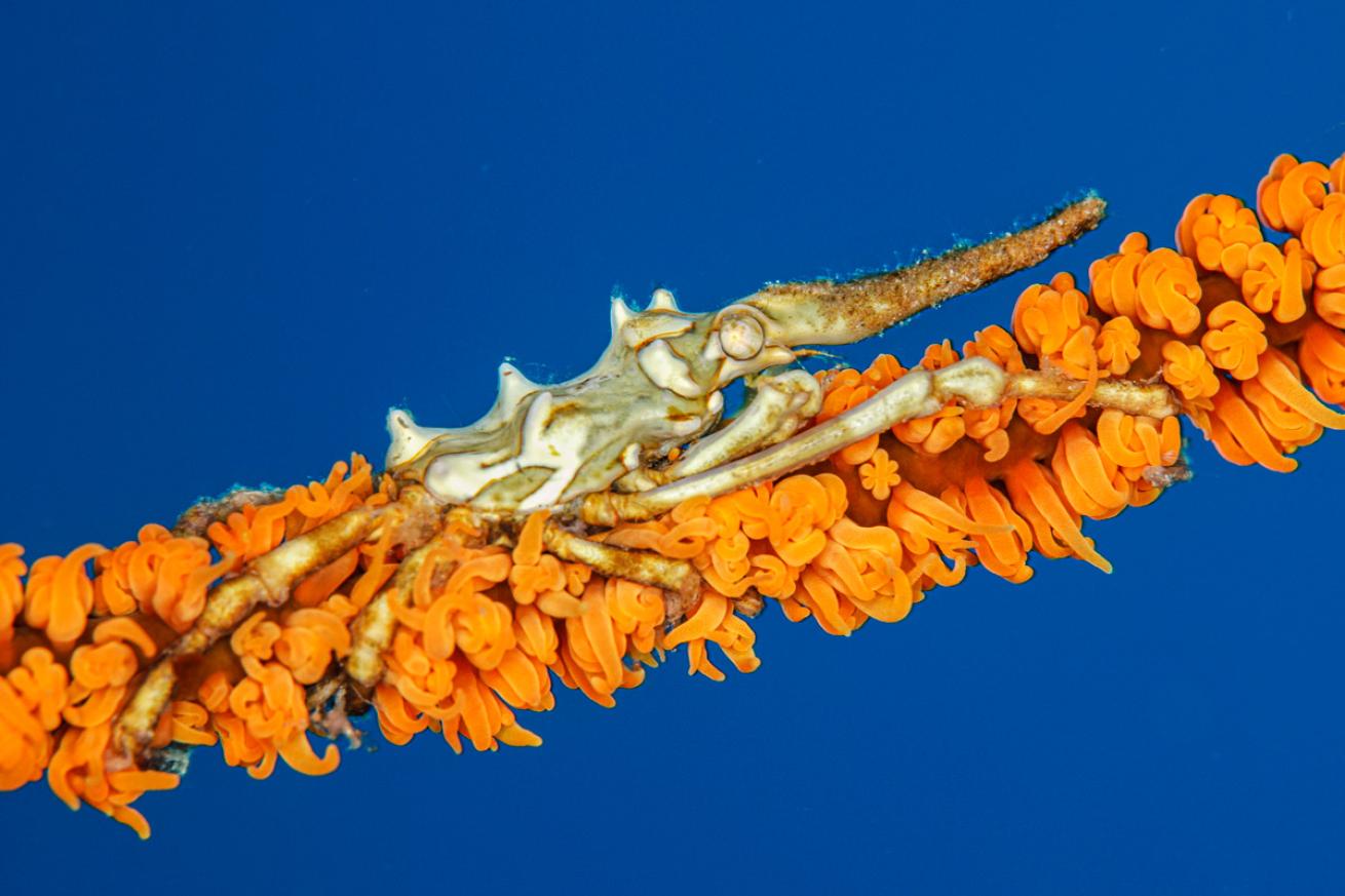 We check off a few more “most-wanteds” midday at Serena Besar—a red paddle-flap scorpionfish, a blue-ringed octopus, harlequin shrimp—before we hit pay dirt in the afternoon at Critter Hunt, where there appears to be an official gathering of the craziest creatures Lembeh has on offer, including tiger shrimp, dragon shrimp and a Melibecolemani, aka ghost nudibranch. This weird-looking translucent nudibranch is rare enough that it wasn’t even on our critter list. It so closely resembles a jumbled pile of spaghetti that my guide has to point it out twice, and even then it takes a while before I can figure out which end is the front.