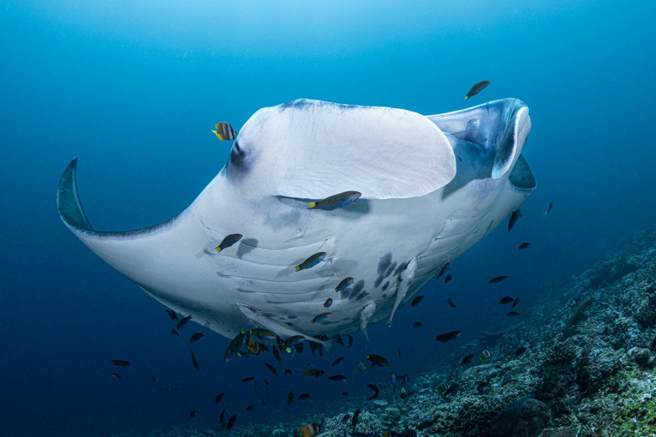 This is particularly evident at Manta Ridge, where I count at least eight mantas feeding in the current next to the ridge itself, a shallow, pristine hard coral reef dotted with cleaning stations. The current is so fierce that it’s all I can do not to get pulled over the ridge at first. But it slows enough to allow me to hoist my camera into position when the mantas conclude their meal and approach us. They hover over our heads again and again, taking turns getting a post-lunch tidying.