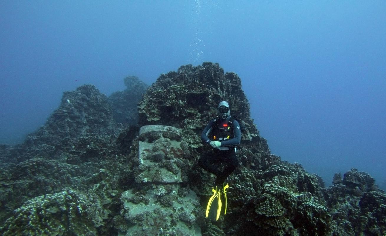Carrie MillerChris Taylor diving next to a submerged moai, a sunken movie prop that provides a fun photo opportunity.