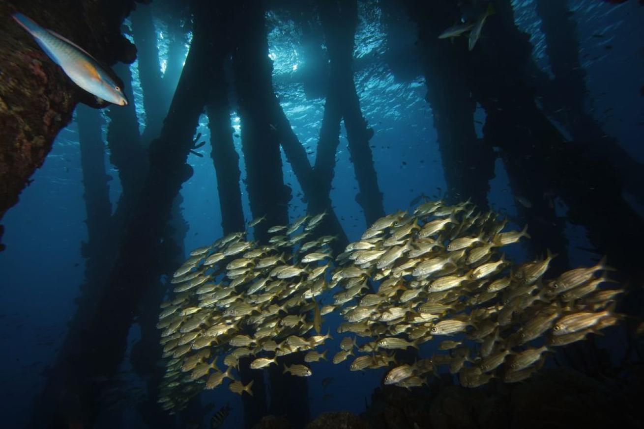 Divers kick between tube and rope sponges reaching from the submerged beams, while fish and invertebrate life scuttle along the sea floor. Curious barracuda occasionally dawdle behind divers as they explore.