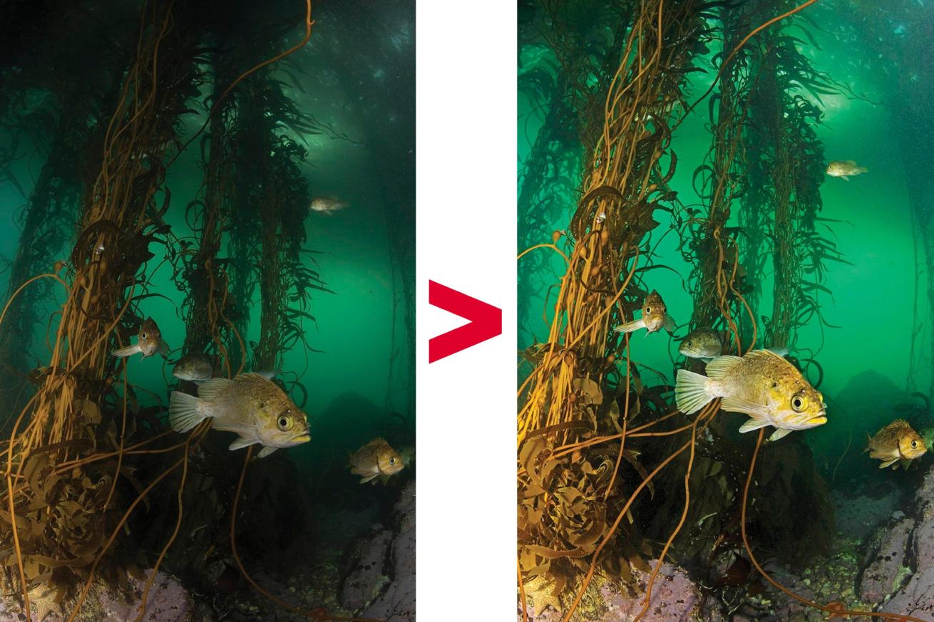 There are two main reasons to edit your photos. First, most underwater photos could benefit from white balance (color temperature) adjustment to ensure the colors represent your vision for the scene. Color is lost at depth, and even if you shoot a manual white balance or use a red filter, there is often a need to make additional adjustments when editing. If you use a video light or strobe, the Kelvin temperature of the light source paired with the camera’s auto white balance measurement will require you to make small adjustments for maximum color pop.