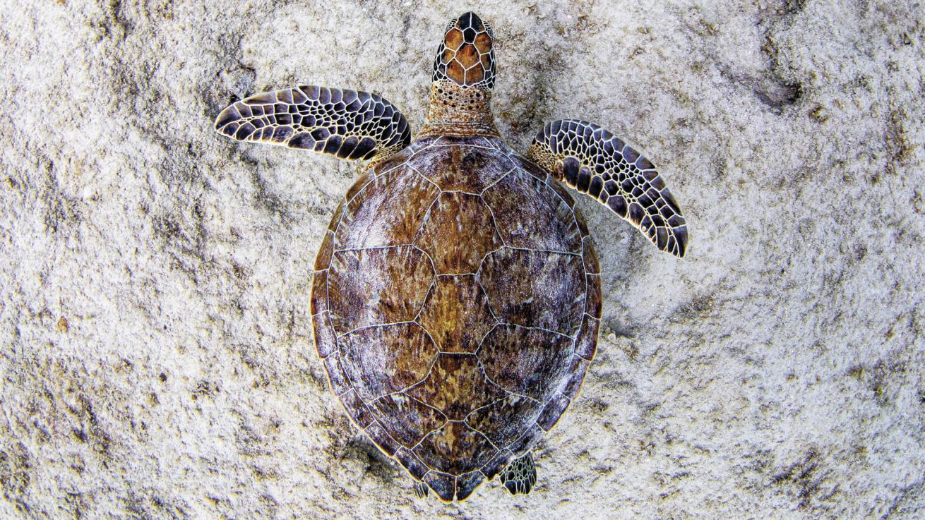 Casper DoumaA hawksbill sea turtle swims over a sandy bottom at the popular Bonaire dive site Salt Pier.