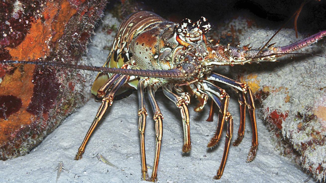 Eric RieschA Caribbean spiny lobster crawls in the sand on a Bonaire reef.