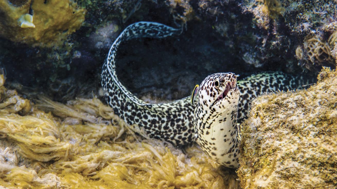 Jeff StamerA spotted moray eel pokes out from some rubble.