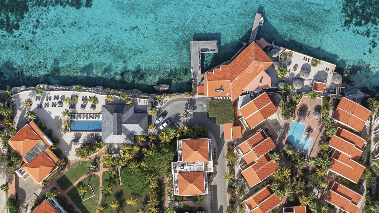 Lorenzo MittigaAn overhead view of Buddy Dive Resort and its house reef.