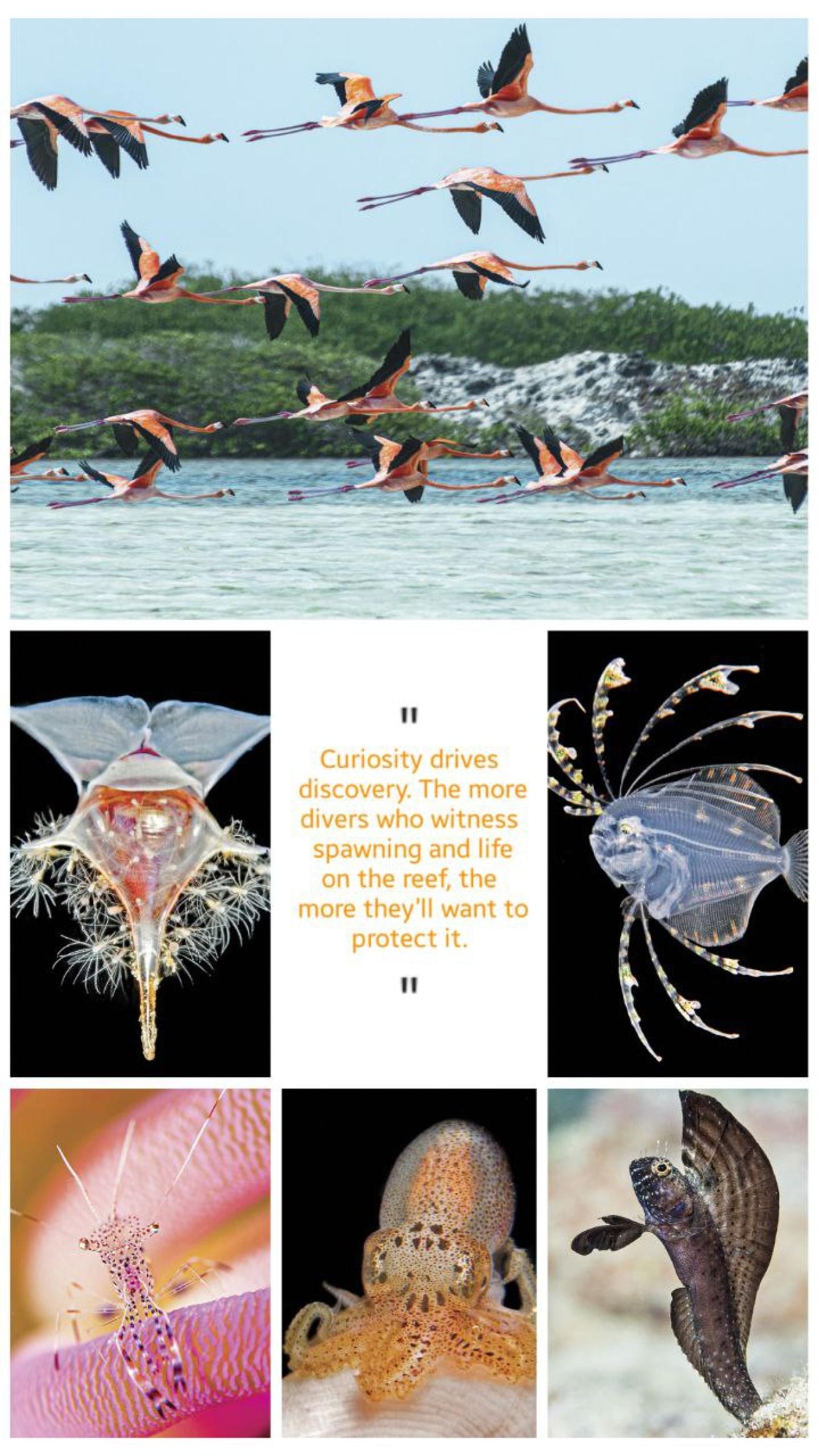 Clockwise from top: Jeff Stamer; Ned Deloach; Casper Douoma; Ned Deloach; Casper Douma; Ned DeloachClockwise from top: The island is a breeding ground for flamingos; a spotfin flounder; a sailfin blenny; a paralarval octopus; a pink spotted cleaner shrimp; a sea butterfly enmeshed in a hydroidcolony.
