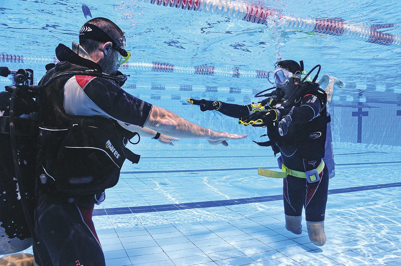 Van der Poll, a PADI Course Director, teaches a Palestinian refugee who lost his legs how to dive.