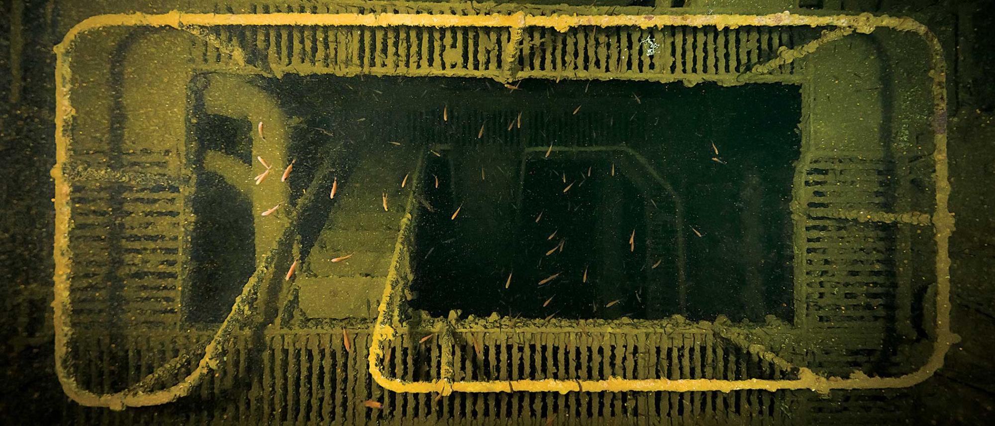 It’s one room that’s less about penetration than it is about depth. Says Captain Doug Hammock of H20 Below charters, which takes tec divers to the site, “The bays are wide open — keep in mind that the elevators are big enough for a jet to come through.”