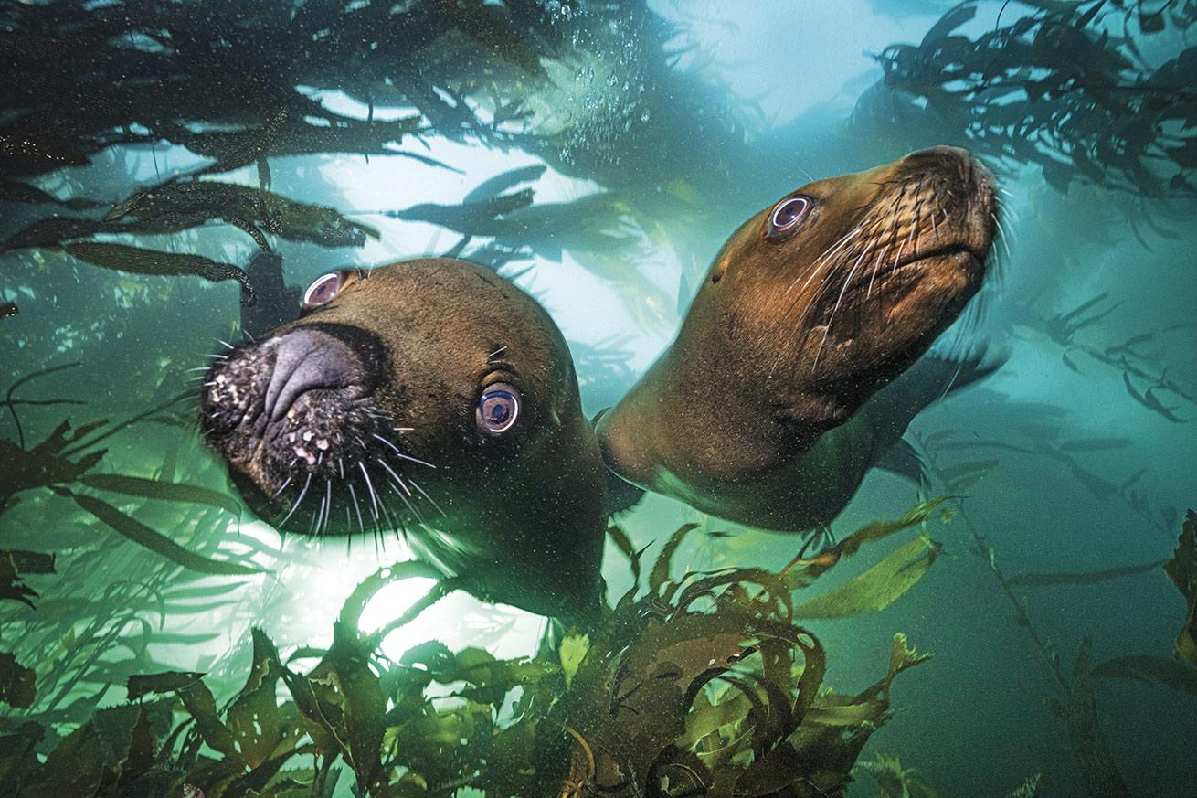 Patrick WebsterTwo curious South American sea lions (Otaria flavescens) swing by to investigate the bizarre beasts blowing bubbles in their kelp kingdom.
