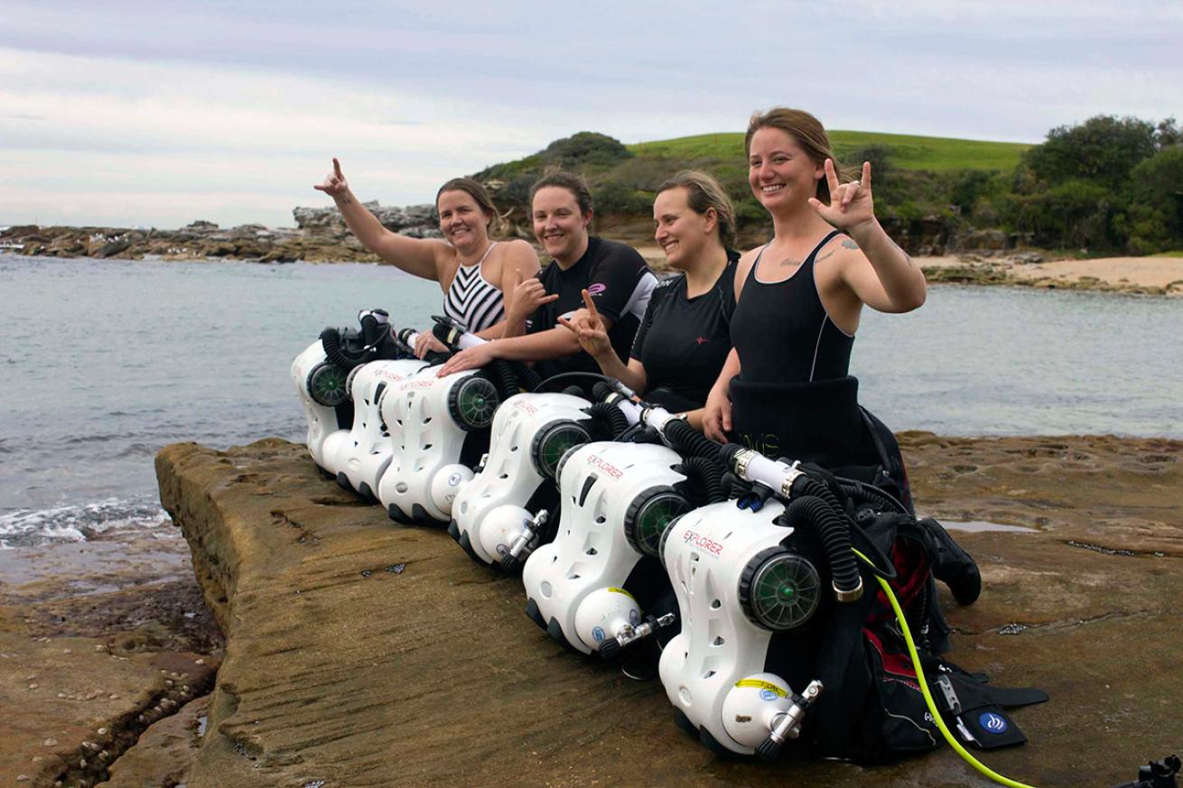 Under the expert instruction of PADI Course Directors Peter Letts and Jamie Miller, and using the Hollis Explorer Sports Rebreather, (a hybrid semi-closed rebreather) the women — all PADI professionals from Abyss Scuba Diving in Ramsgate NSW — took to Little Bay dive site next to Botany Bay in Sydney for their PADI Rebreather Hollis Explorer Instructor assessments.