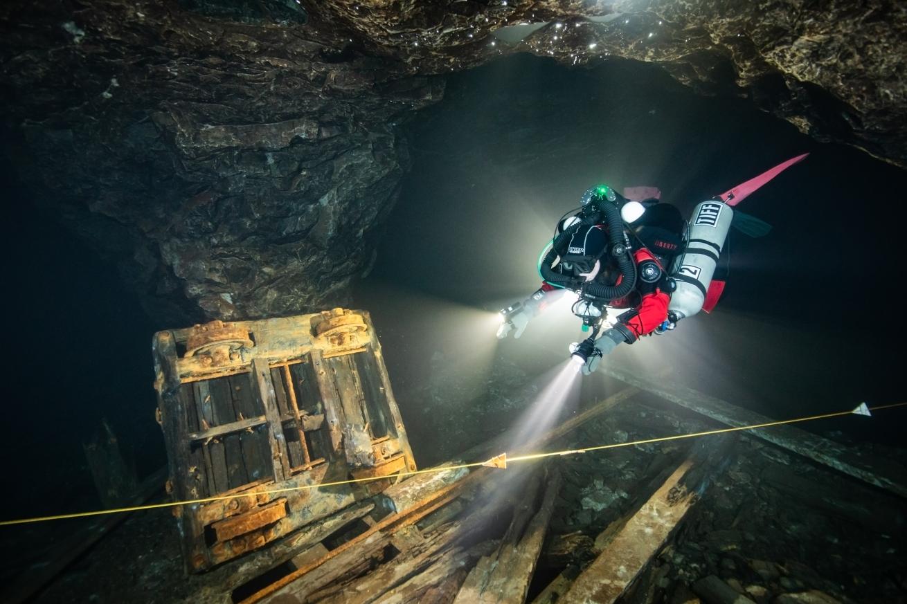 Gatien CosendeyRivoira spots an old cart used for hauling materials in a now-flooded Swedish mine.