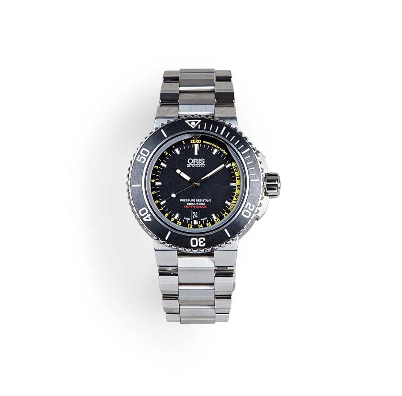 Combining elegant design with practical function, this timepiece indicates depth to 328 feet and features automatic winding with 38 hours of reserve power.