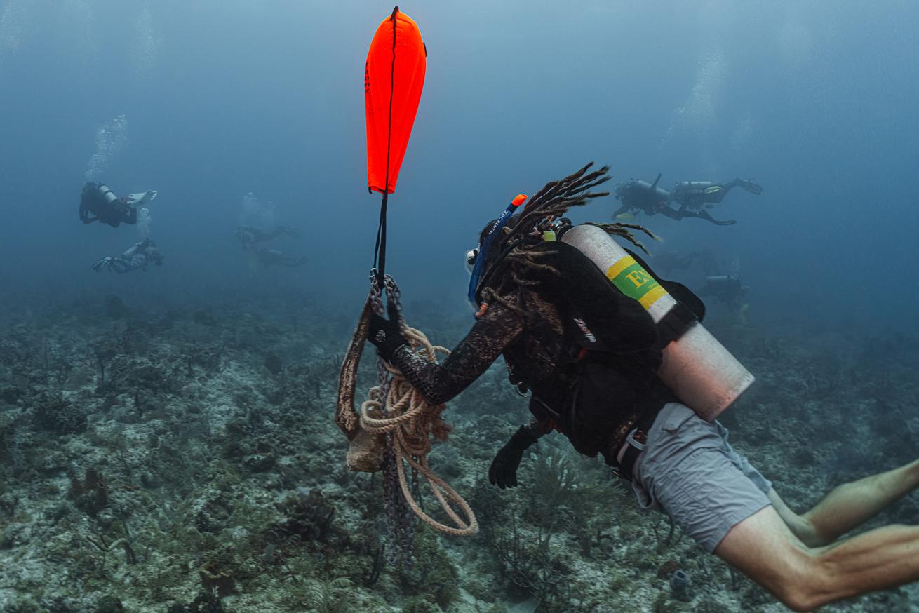 Diver Andrew Morris removes an anchor attached to a rope from a reef off Islamorada, using a lift bag to help him safely bring the debris to the surface.