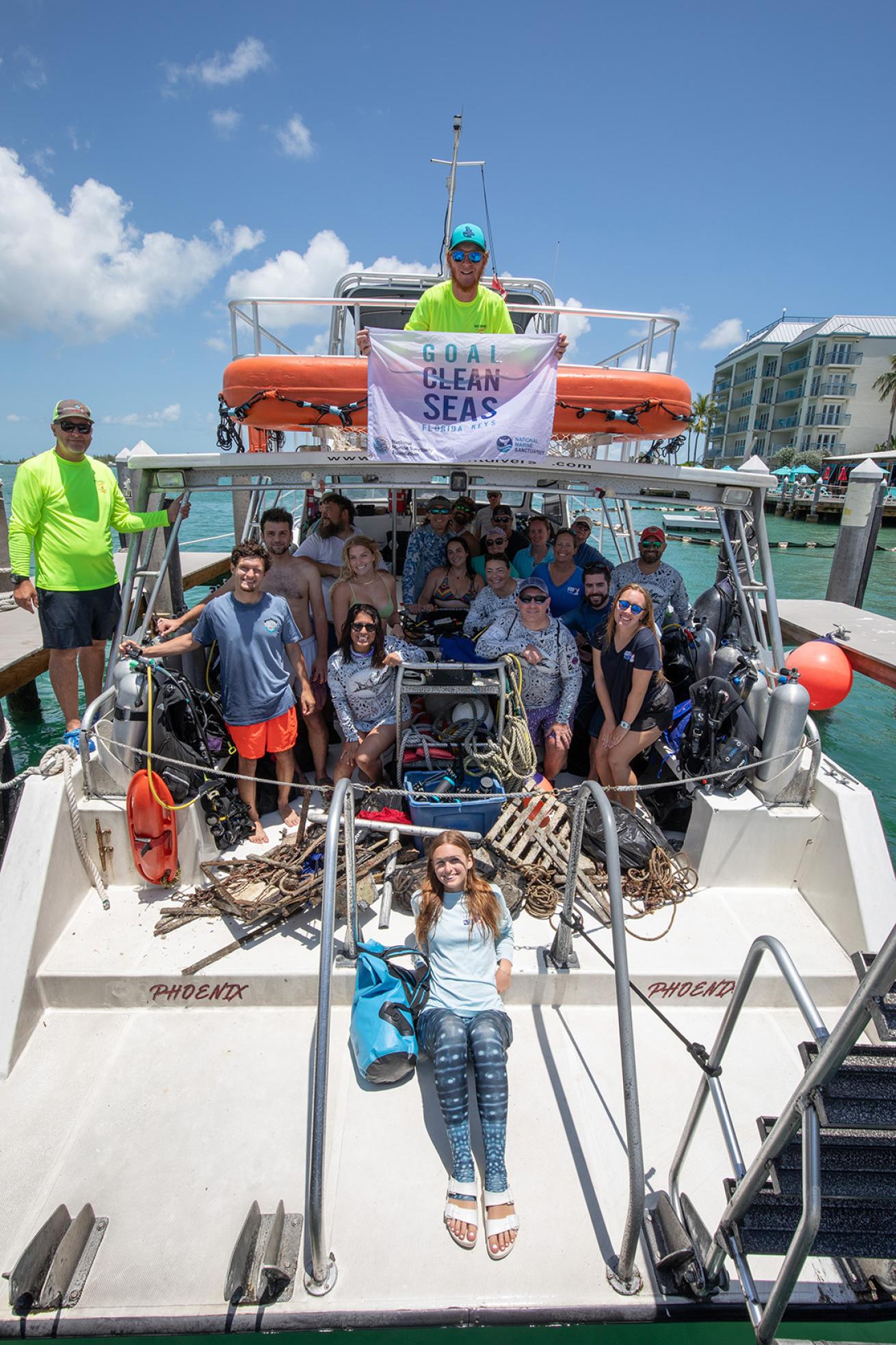 Participants pose on Southpoint Divers after a successful dive against debris.
