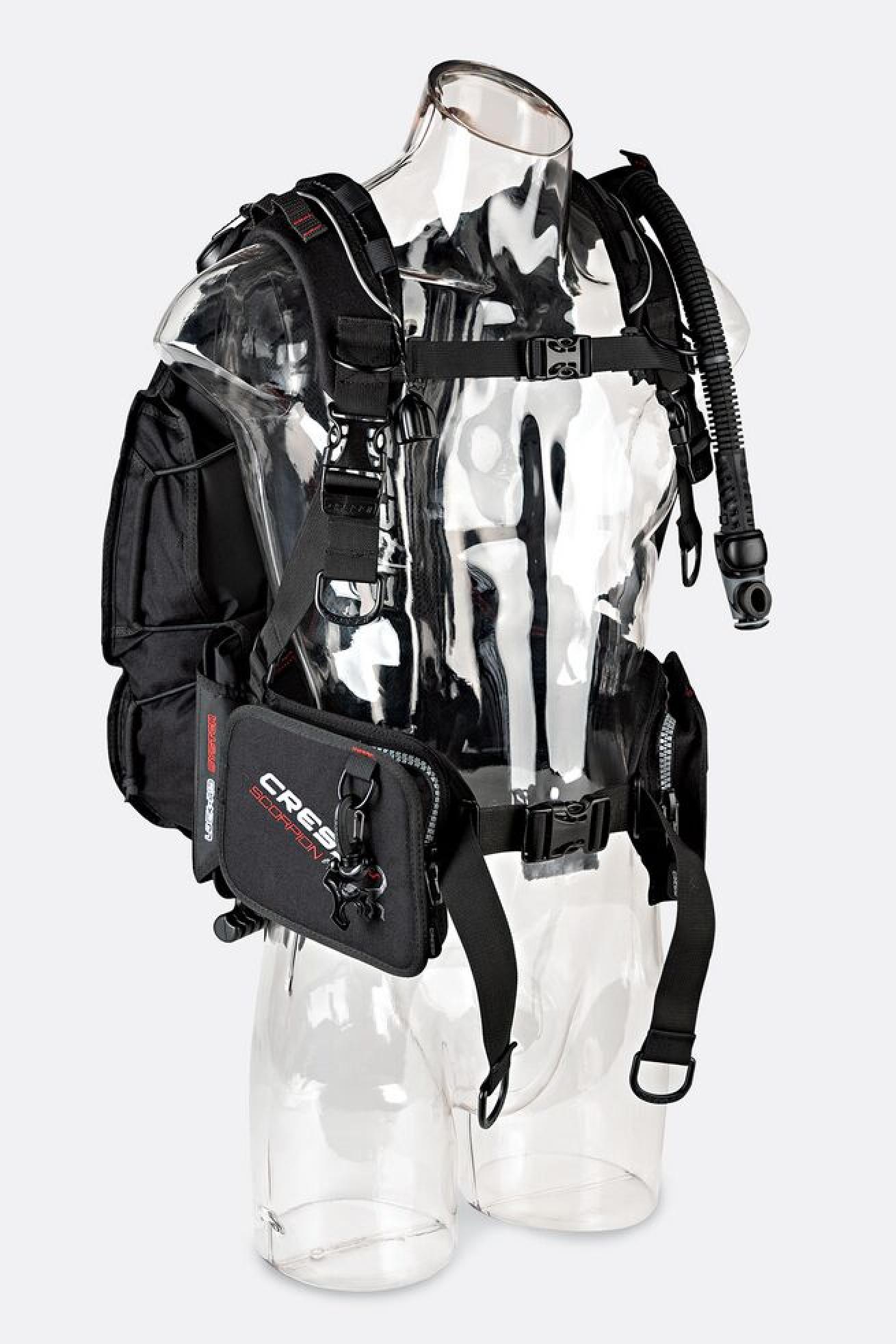 This makeover of the Scubapro Seahawk is very comfortable and stable in the water. It packs more than 50 pounds of buoyant lift in size large and the integrated weights hold 24 pounds, not including the trim pockets. There are plenty of options for stowage including a pair of roomy zippered cargo pockets and eight stainless D-rings. The BC can be outfitted with Scubapro’s Air2 power inflator and features a rear exhaust for buoyancy control. Despite generous padding throughout, this BC still folds up as small as most travel-oriented BCs. This BC is capable of everything from tropical diving to drysuit duty.