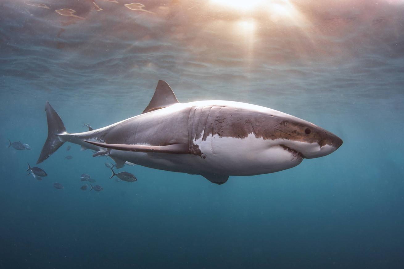 Courtesy Andrew Fox/Rodney Fox Shark ExpeditionsA white shark swims near the surface at the Neptune Islands.