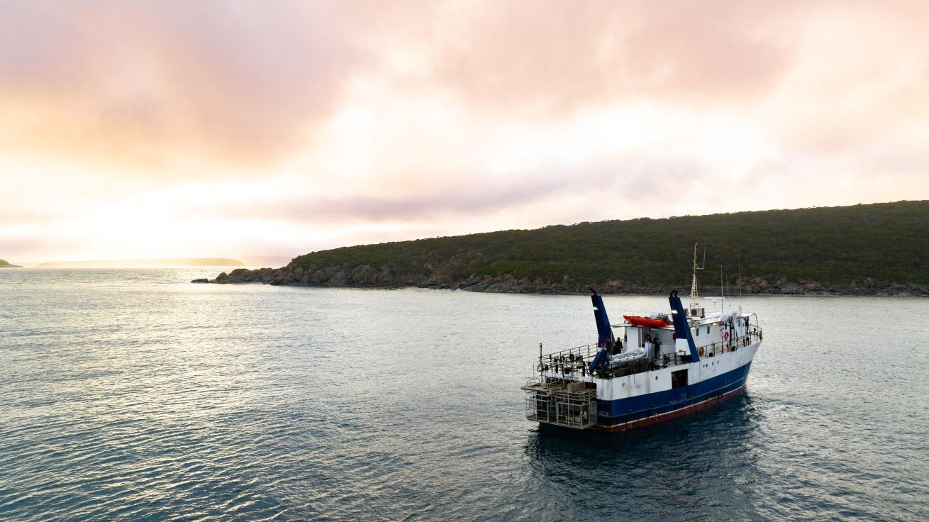 Courtesy Andrew Fox/Rodney Fox Shark Expeditions“The Rodney Fox” cruises through the Neptune Islands in South Australia.