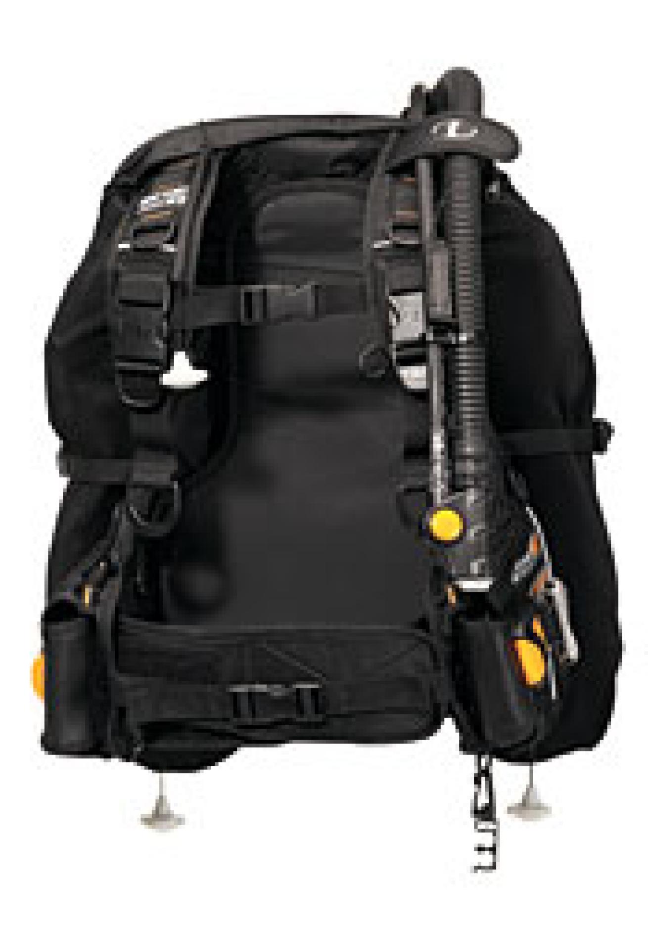 The H2Odyssey Venture is one of the truly unique BC designs for 2007. The wings of its 30-pound air cell wrap around the tank and are housed inside a zippered neoprene sleeve for a streamlined profile. Inside the sleeve there's a standard tank band, plus a stabilizing strap that also acts as an attachment point for trim weights. To test this BC, our divers used a range of tanks from a small steel 80 to a steel 120 and found the Venture to be a stable swimmer with all of them. The one drawback to this design, however, is the inherent buoyancy of the neoprene sleeve, which we measured at just over three pounds-the most of any BC in this review.