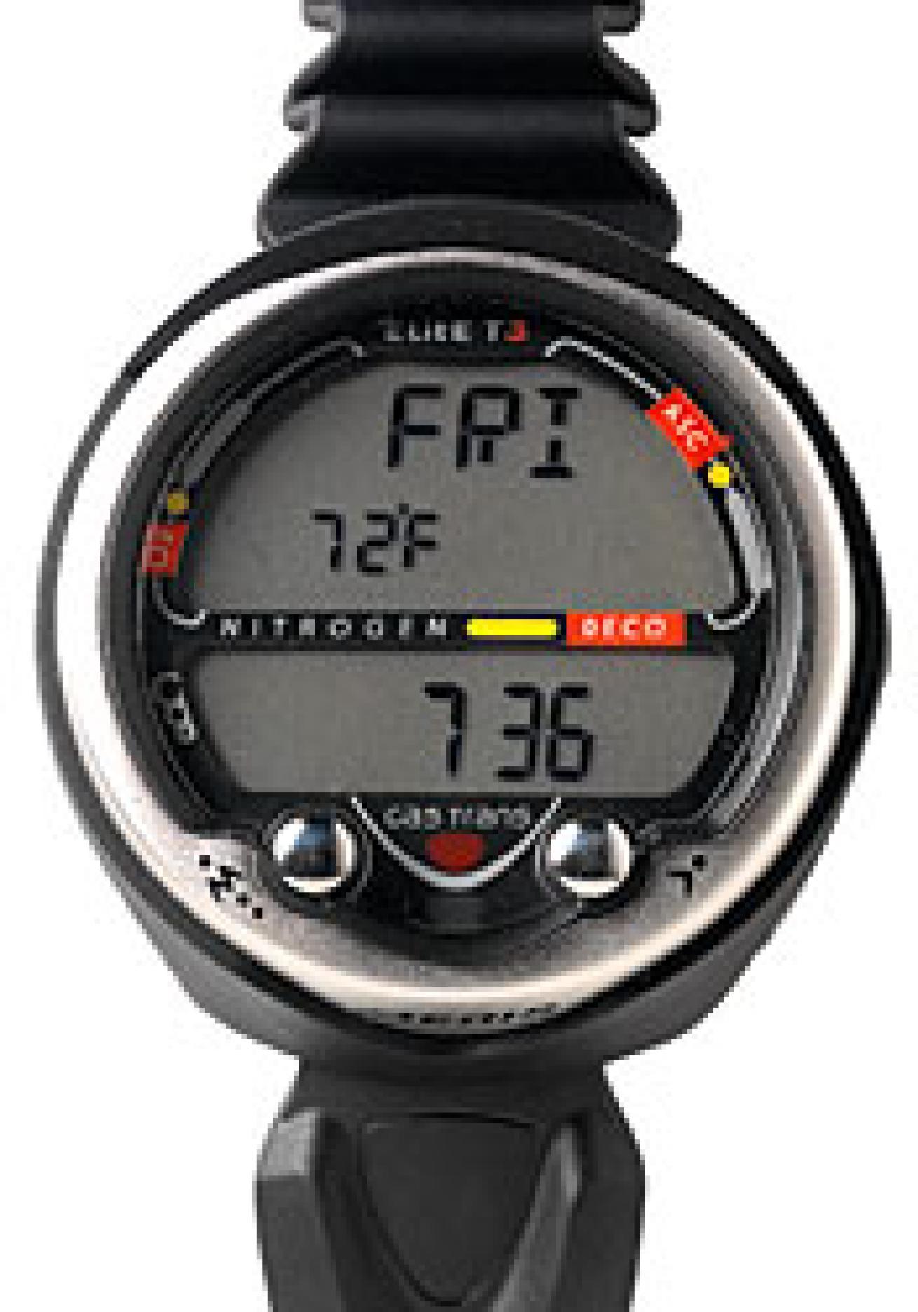 If you want a computer that does it all with the easy readability of a full-sized gauge, there are only two choices in this test group, the Aeris Elite T3 and the Oceanic VT3. Both are wireless, air-integrated computers that can track three different gas mixes (up to 100 percent oxygen) using three different transmitters. They also feature the clever Buddy Pressure Check function that allows you to keep tabs on the tank pressures of up to two other divers. Compared to wristwatch-style machines, the digits are bigger, the bar graphs bolder and everything you need to know is displayed on the main screen, earning both these computers the highest overall scores for readability. "The screens are super easy to read and so intuitive," said one test diver. While the Aeris Elite T3 and Oceanic VT3 offer all the same functions, there is some sibling rivalry in how they choose to display their information--particularly when it comes to bar graphs for ascent rate, nitrogen loading and oxygen loading. Compare the computers side-by-side, and you'll see that the Aeris Elite T3 uses larger, bolder segments in the bar graphs and a color-coded scale, earning this feature the highest numeric rating from test divers. The Oceanic VT3 is no slouch, however. It's more elegant and understated bar graph presentation is still easy to read and earned the second-highest rating from test divers.