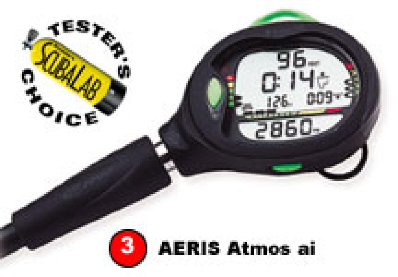 The Atmos ai is the newest air-integrated member of Aeris' Atmos family. It features a large horizontal screen nestled in a small case, a programmable backlight, and both visual and audible alarms. The Atmos ai presents data with huge primary digits (depth blinks continually whether descending or ascending) and good-sized secondary data digits, and makes generous use of graphics and green-yellow-red highlights.
