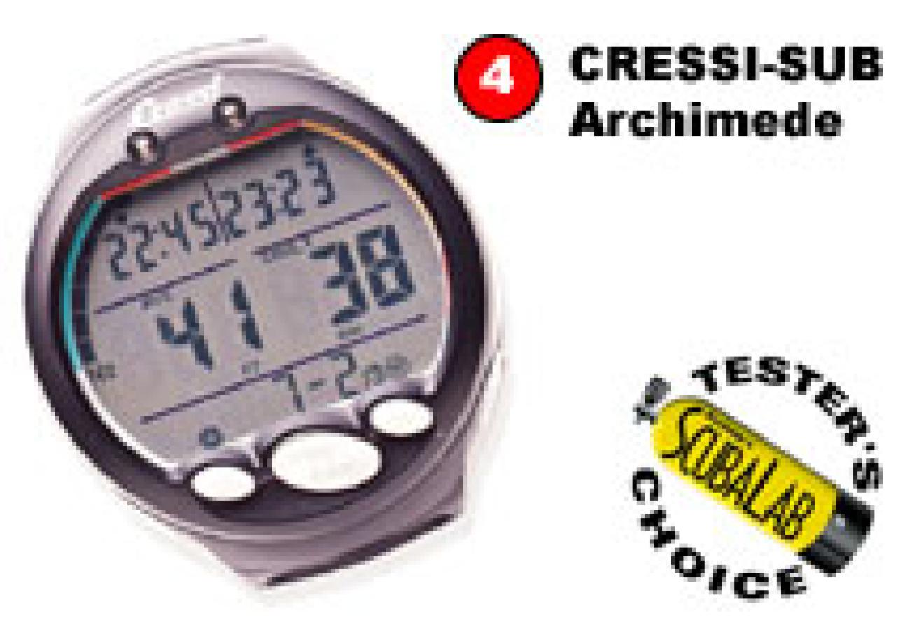A full-featured wrist-mount dive computer (now available in console), Cressi-sub's Archimede uses a central Mode button along with A and B buttons in one of the easiest systems for accessing data, programming functions and activating the five-second backlight. The computer uses three-color bar graphs, although these are relatively narrow. All data digits are extra-large and easy-to-read on a well-designed display that includes "Time," "Plan," "Log" and other prompts at the bottom of the screen to show you what mode you're in. Both audible (disarmable) and visual alarms are provided for critical dive situations.
