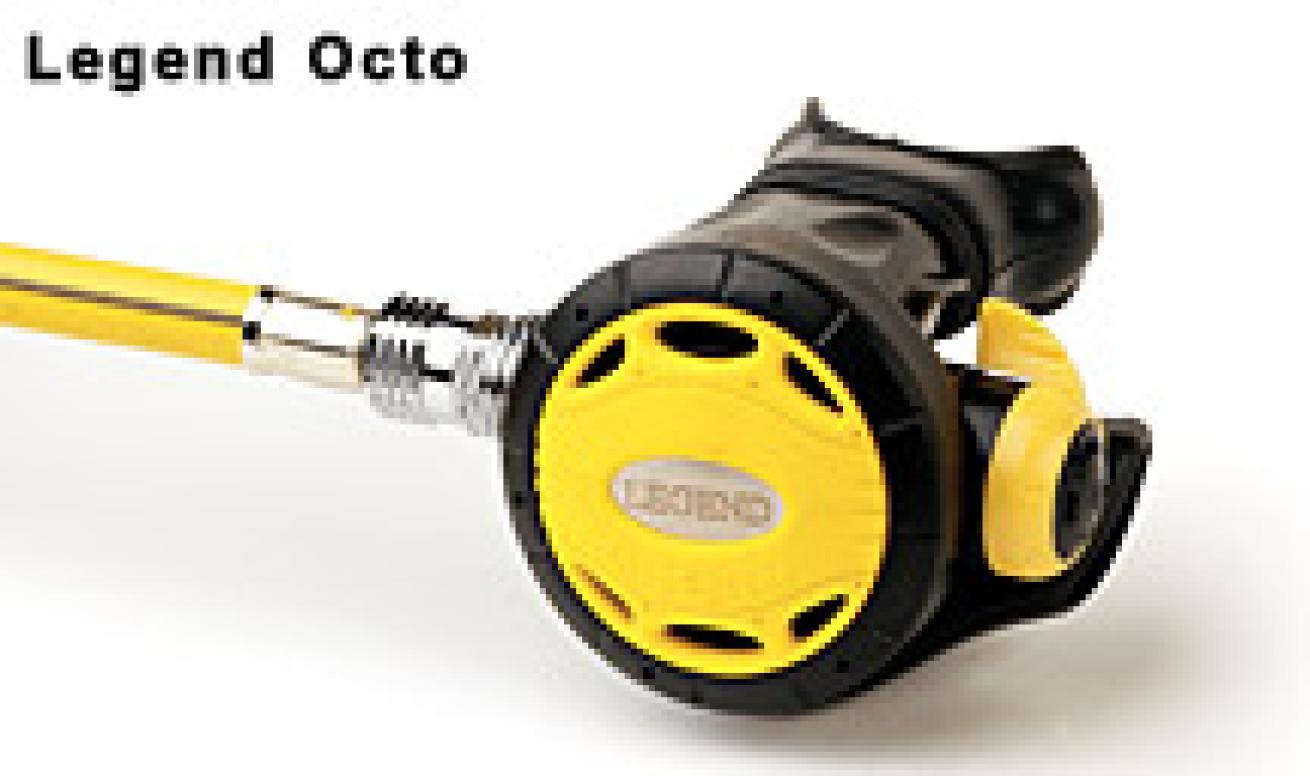 If you're a fan of Legend regulators, you're going to love the pneumatically balanced Legend Octo, because with the exception of a longer, high-vis yellow hose (39 inches) and a high-vis yellow full-cover purge and Vane Adjustment Switch (VAS), this is the same second stage. The Legend Octo proved to be a test diver favorite. A great breather in all positions, the octo is very dry, and because it has a wider exhaust tee than most octos, there is minimal bubble interference. The flexible, full-cover purge is easy to find and use, and the Venturi Adjustment Switch (VAS) is efficient in detuning the octo so it won't free-flow. The reg comes fitted with a heat exchanger for use in cold water and a standard-sized mouthpiece.