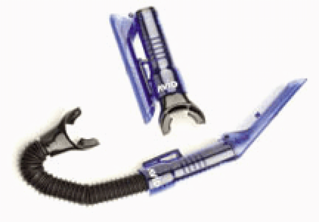 The Avid is a bona fide foldable snorkel. The rigid plastic body is hinged, and a corrugated hose with silicone mouthpiece tucks up into the body for storage. The folded unit stows easily in a BC pocket. When you need it, simply unfold the body and snap it into position, pull down on the mouthpiece to extend the corrugated hose to the desired length, clip it onto your mask strap and you're ready to snorkel.