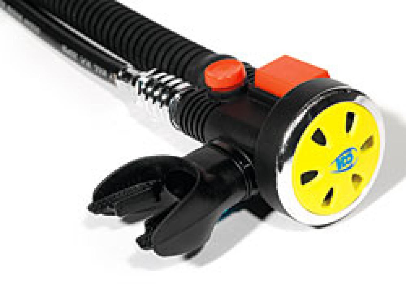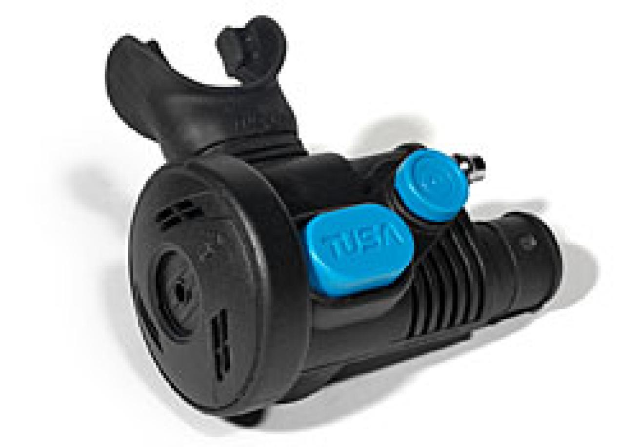 Features: Scubapro is the company that started it all, releasing the very first alternate inflator reg--the AIR--in 1979. The company has continued to refine its concept into what is now called the AIR 2. One of the most compact ergonomic designs of this test group, it's built from rugged fiberglass-reinforced nylon. The buttons are ergonomically correct and well positioned, making the unit easy to use. It also uses a fixed VIVA flow vane, pre-tuned in the ideal position to prevent surface free flows. The AIR 2 will fit any one-inch corrugated hose, and it comes from the factory nitrox-capable for mixes up to 40 percent oxygen.