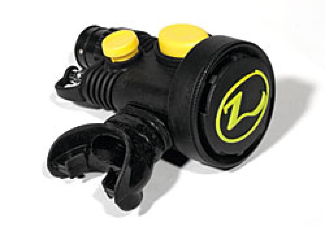 | | Zeagle: Octo-Z| Features: The Octo-Z is a newcomer to the market. It's compact, made of durable thermoplastic and has brightly colored control buttons. Zeagle has also made it easy to remove the Octo-Z from the corrugated hose by providing a threaded fitting. After you remove the unit, you can use the same threaded fitting to attach your garden hose to the BC to flush salt and sand out of the bladder. Your Octo-Z can then be stored with your primary regulator. Its threaded coupler will fit any corrugated hose with a one-inch diameter, and the unit comes factory-ready for nitrox mixes up to 40 percent oxygen.