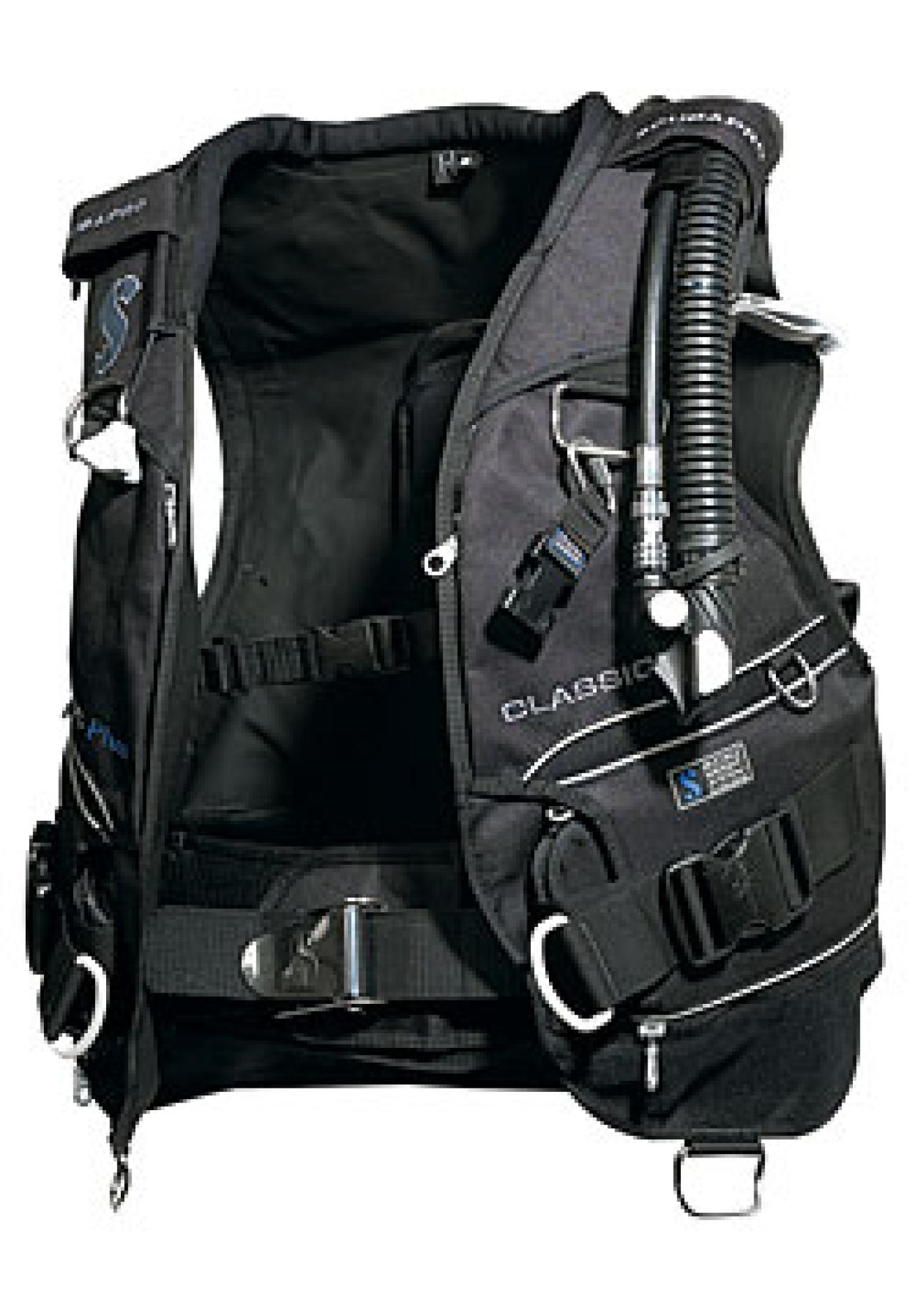 The unique air cell on the Classic Plus stabilizer jacket is a 20-year-old proven design, but it still rated highly with our test divers when compared head-to-head with the newest models. The stabilizer buoyancy cell provided a stable, predictable attitude underwater and at the surface. A curved hard pack with rubber nonslip pad, coupled with a single-strap stainless-steel buckle, steadies the tank and eliminates wobble. The Classic Plus comes loaded with all the goodies divers expect in a modern BC: an integrated-weight system, streamlined power inflator, a depth-compensating cummerbund and secure trim-weight pouches--to name just a few. Bonus: It registers zero inherent buoyancy. The low-profile power inflator is small, but it provides easy touch recognition. The pull dump and remote dump valves vent air rapidly for ascent control our divers rated as Excellent. The mechanical weight system provides a secure hold on your ballast, but ditching the weights requires you to pinch the buckle and then pull the pocket free--though with practice it can be done in one continuous movement. Foam padding along the back/lumbar region, a soft neoprene neck roll and a depth-compensating cummerbund make for a comfortable BC, but choosing the correct size is vital as there are no shoulder straps to adjust fit. Price: $761; $882 with Air 2 alternate inflator reg (not shown).