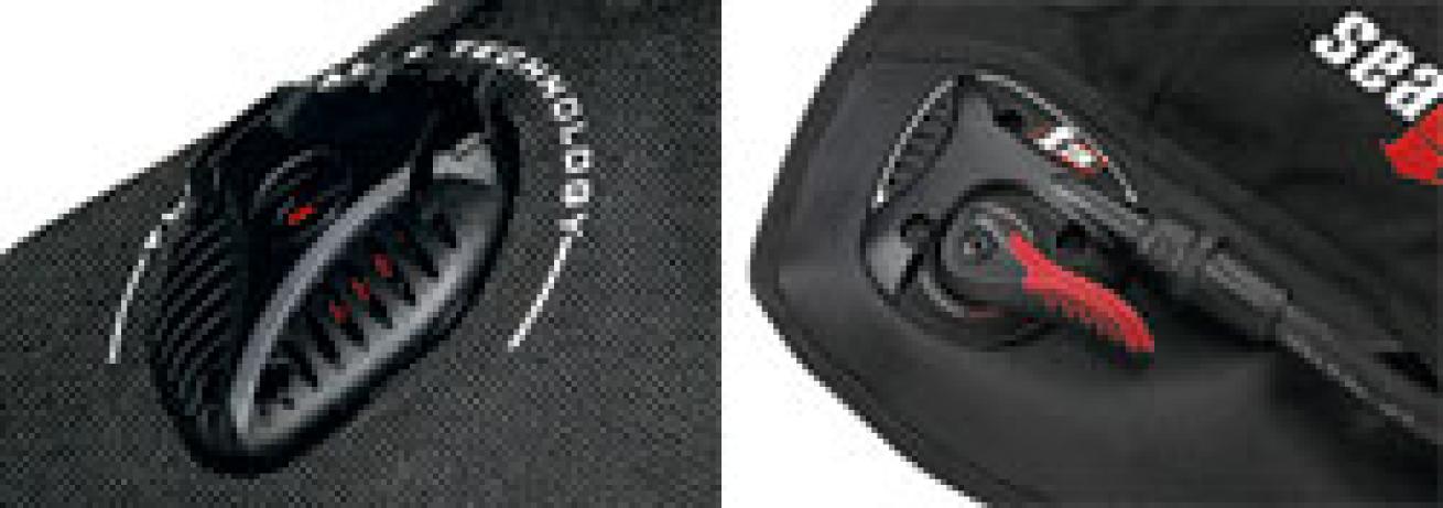 | Tusa BCJ 6900 X-Pert BB (top) Advanced Weight Loading System (left), Cam buckle with "half-closed" position for easier lock-down (right)|