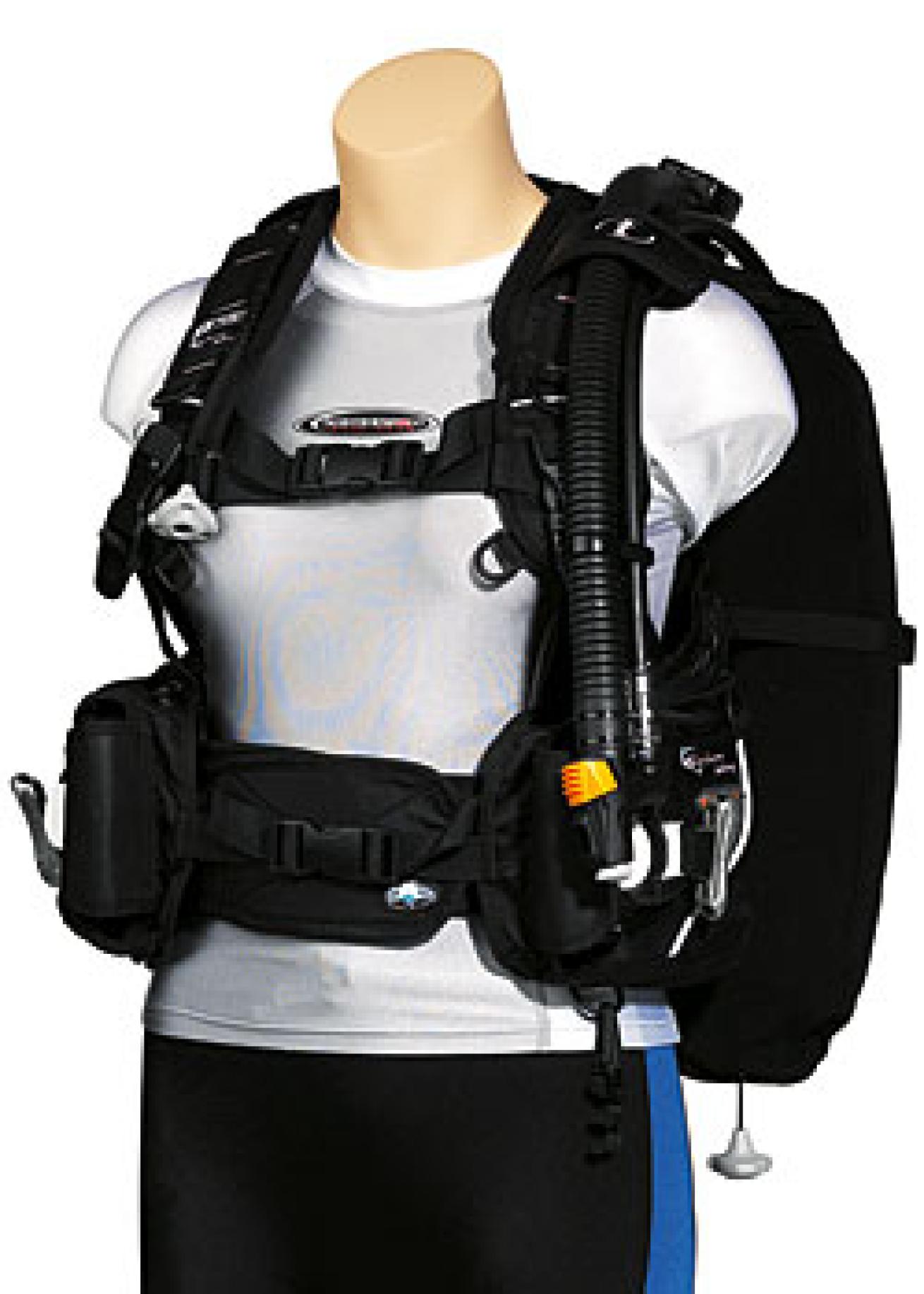 Back-buoyancy BCs put all their inflation behind you. Up front, you have nothing but shoulder and sternum straps and a couple of contoured weight pouches. You'll never suffer from body squeeze, but achieving good stability at depth requires the proper positioning of ballast and trim weights.