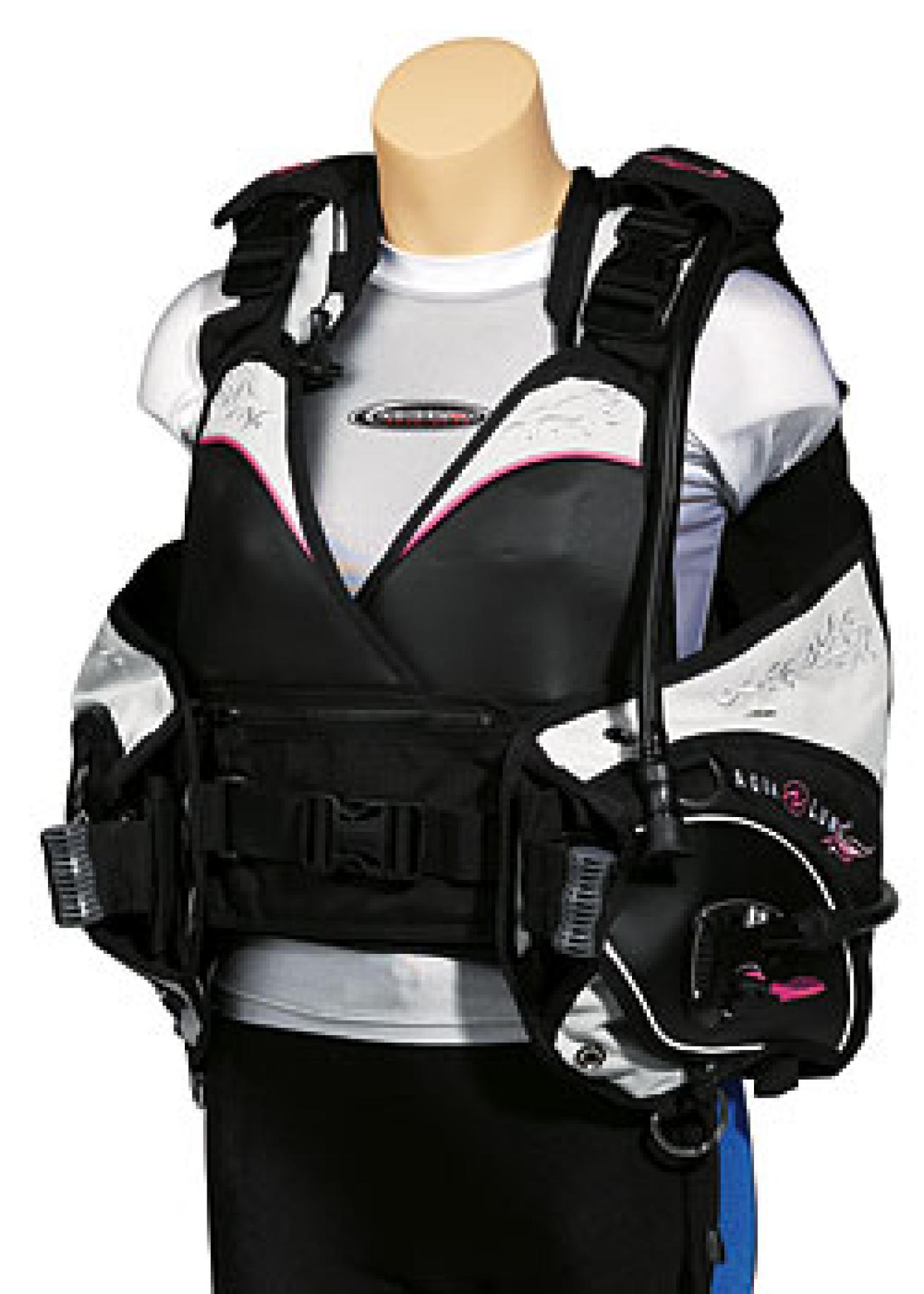 Features This BC features Aqua Lung's i3 inflation system, which replaces the corrugated inflator hose with an intuitive lever control. Lift the lever to inflate; press down to deflate. Push-rod technology simultaneously activates both upper and lower low-profile exhaust valves to deliver pinpoint buoyancy control regardless of your position in the water. Female-friendly features include high-cut sides, good lumbar padding, a rolled collar and a sports bra-styled neoprene front that attaches to an adjustable, depth-compensating cummerbund. The length of the shoulder straps can also be adjusted to match body shape. For handling ballast, Aqua Lung fitted the Pearl i3 with its proven SureLock integrated-weight system, and for storage, it provided three zippered pockets, one large drop-down, one mid-sized bellows pocket and one small pouch on the cummerbund. You'll also find plenty of D-rings, plus mounting grommets for a knife, a retractor pouch and two octo-pockets to tame that alternate second stage. The Pearl i3 comes in three color combinations.
