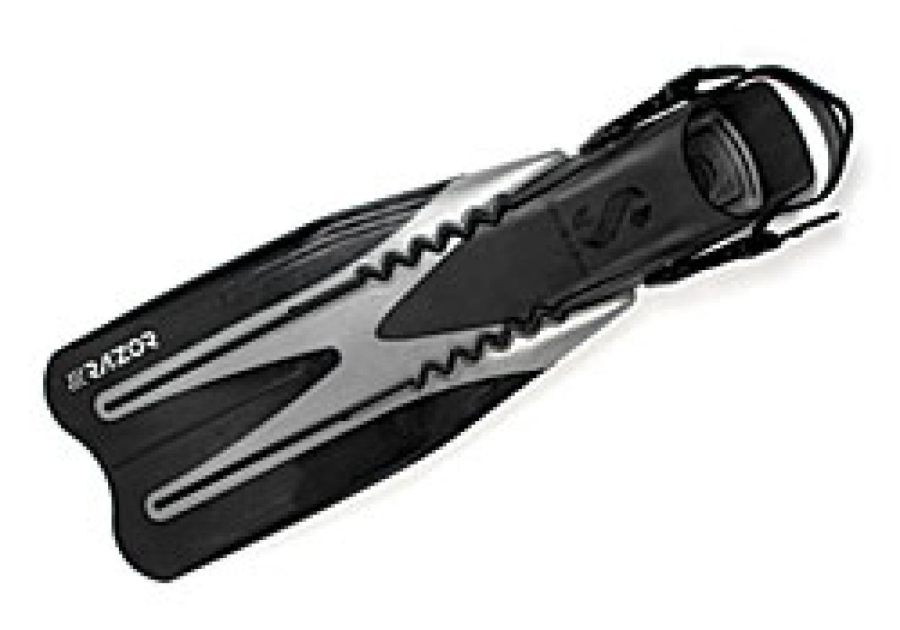 Scubapro Razor On the dive boat, Scubapro's Razor attracts admiring glances. It's a very stylish fin with zigzag spring ribs and side winglets on a rakishly angled two-tone blade.