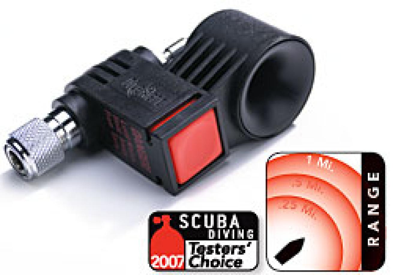 It's the original integrated inflator air horn, and still the loudest we have tested. The company claims that it can be heard up to a mile away, and our results proved them right. The quality of sound is similar to the high pitch of a smoke detector alarm but 100 times louder. At this distance we couldn't see our "diver," but knew he was out there. Dive Alert is offered in three different models to fit a variety of inflators.