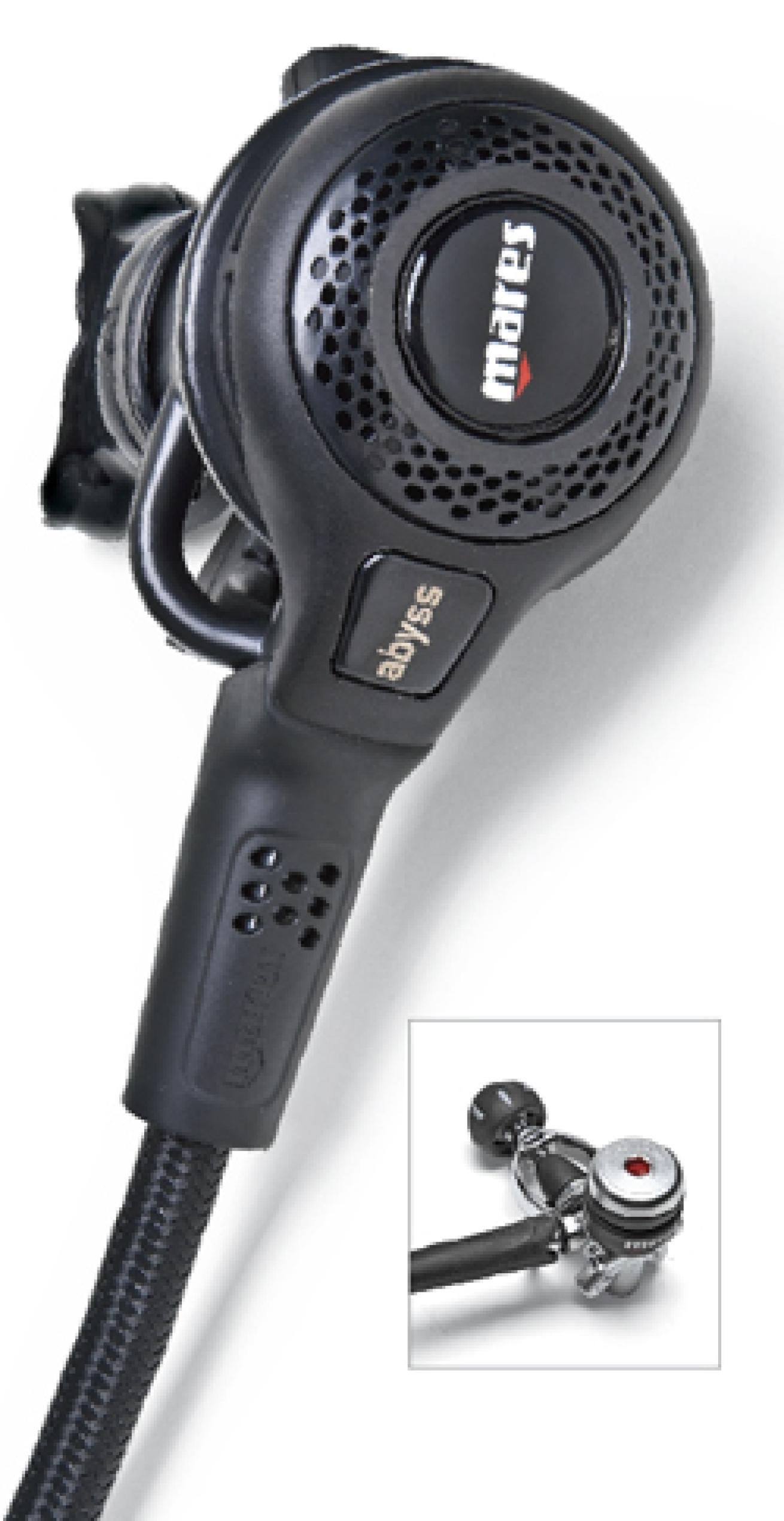 This is the Abyss 22 plus Mares’ new Dry Cold Water Kit, which insulates the first stage and includes a coating for the second stage to prevent ice formation. The first stage has a Tri-Material valve to enhance durability and includes a LP port called Dynamic Flow Control, which minimizes intermediate pressure drop during inhalation. The second stage uses Mares’ VAD — a bypass tube that directs air to the mouthpiece and reduces inhalation resistance. In our tests this reg consistently performed above average. Divers found it to be dry and smooth in all positions, it cleared easily and bubble interference was minimal.