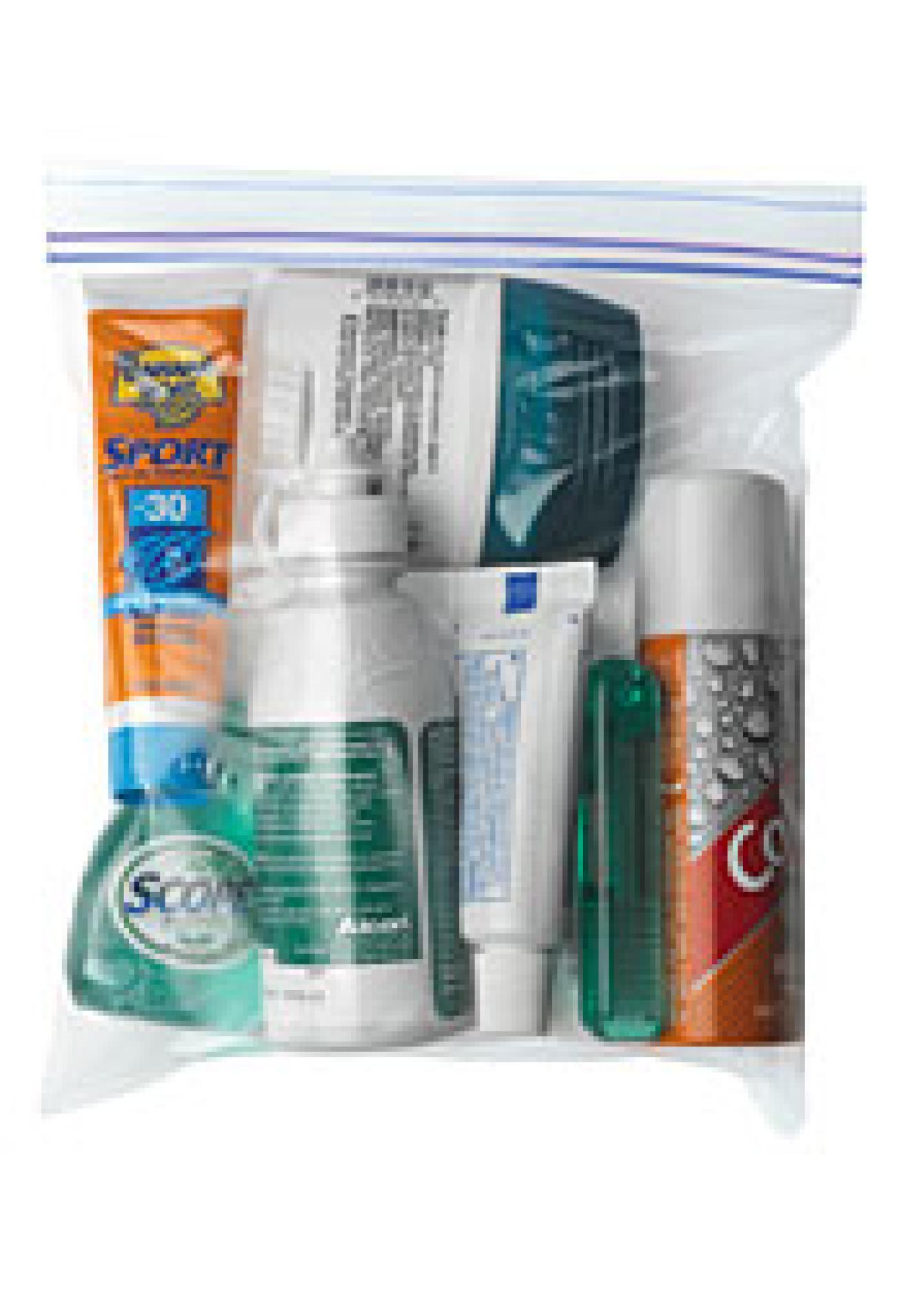 All liquid containers must be carried together in a single, quart-sized, zip-seal bag which can be completely closed.