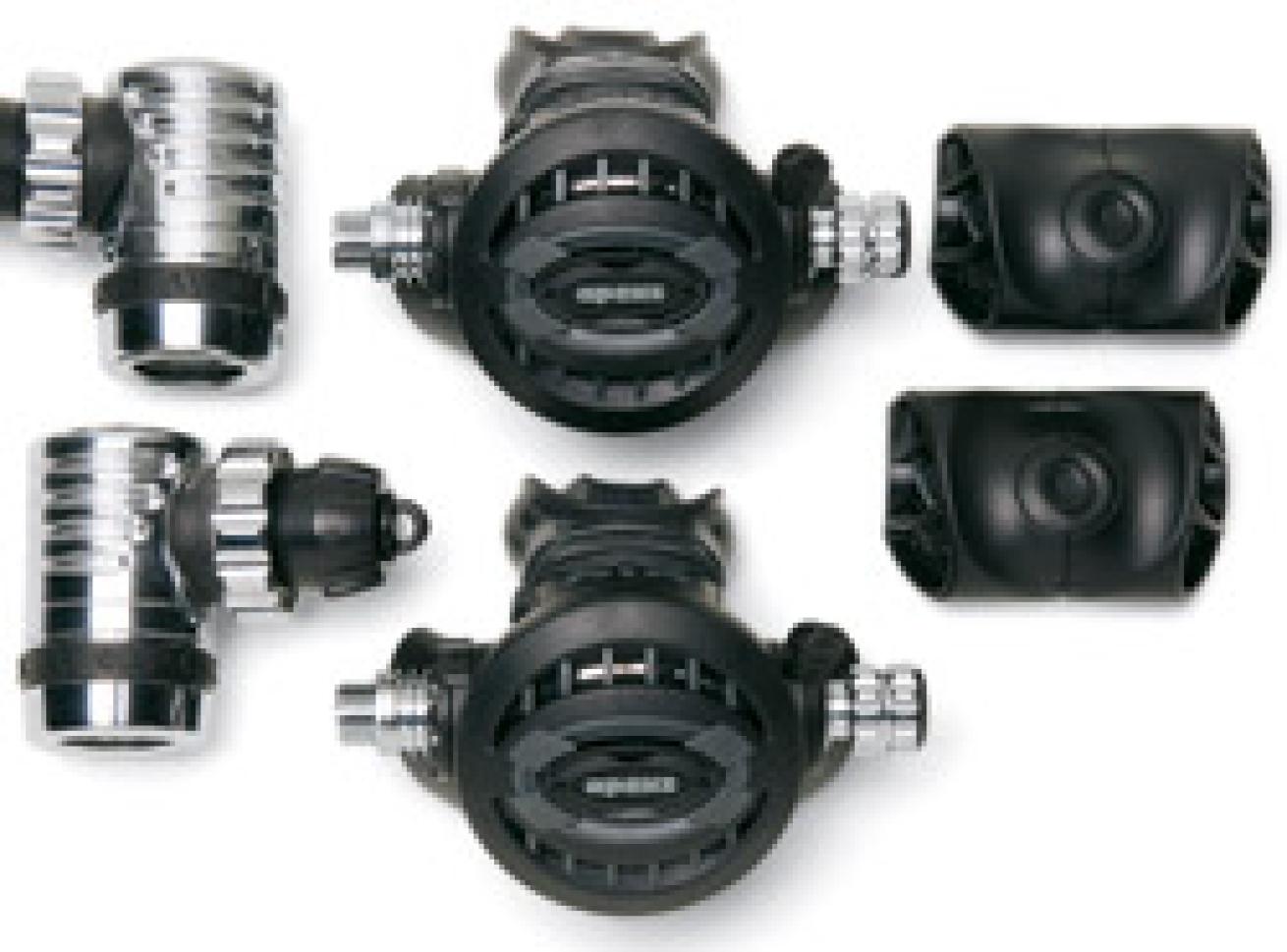 | | Apeks Tek 3 Regulator SetDesigned to be used with double tanks, the set comes with two overbalanced-diaphragm, environmentally sealed, Tek 3 first stages (one left-handed, one right-handed), two pneumatically balanced XTX50 second stages, a 2-meter hose, a standard hose and a reg necklace. First stages have three low-pressure ports and one high-pressure port each. Second stages are equipped with breathing resistance control knobs and venturi control levers. Performance: The Tek 3’s right- and left-hand first stages face inboard and minimize drag while allowing for tangle-free hose routing. ANSTI breathing-machine tests show the Tek3 XTX50 to be a true power breather. Earning the maximum scores possible in our standard breathing tests, it easily ventures beyond that for above-average performance. Ergo tests show the reg to be a smooth, dry breather in all positions with easy-to-operate controls. $1,195 complete, $850 for first-stages only www.aqualung.com | | Atomic Aquatics M1The M1 has a unique blend of materials that make it tec friendly and is nitrox ready to 50 percent. The first stage is a balanced flow-through piston design made of brass and Monel, known for its strength and corrosion resistance. It has two high-pressure fixed ports and five low-pressure ports mounted on a swivel. It’s also environmentally sealed for cold-water use with a heavy-duty metal DIN handwheel. The second stage incorporates zirconium-plated brass and titanium parts, and has a thermal heat sink. Automatic Flow Control, a depth-activated venturi, self-adjusts with depth and protects against free-flow. There’s also a breathing-resistance adjustment knob. A specialty cave ring kit for the front cover is sold separately. Performance: The M1 is one of the easiest breathing and driest regulators we’ve ever tested. Setup on doubles is clean and streamlined, thanks to the swivel-turret first stage. The M1 offers a lot of reserve capacity, acing all standard breathing tests then keeps right on trucking into the higher breathing rates and deeper depths. $699 www.atomicaquatics.com | |